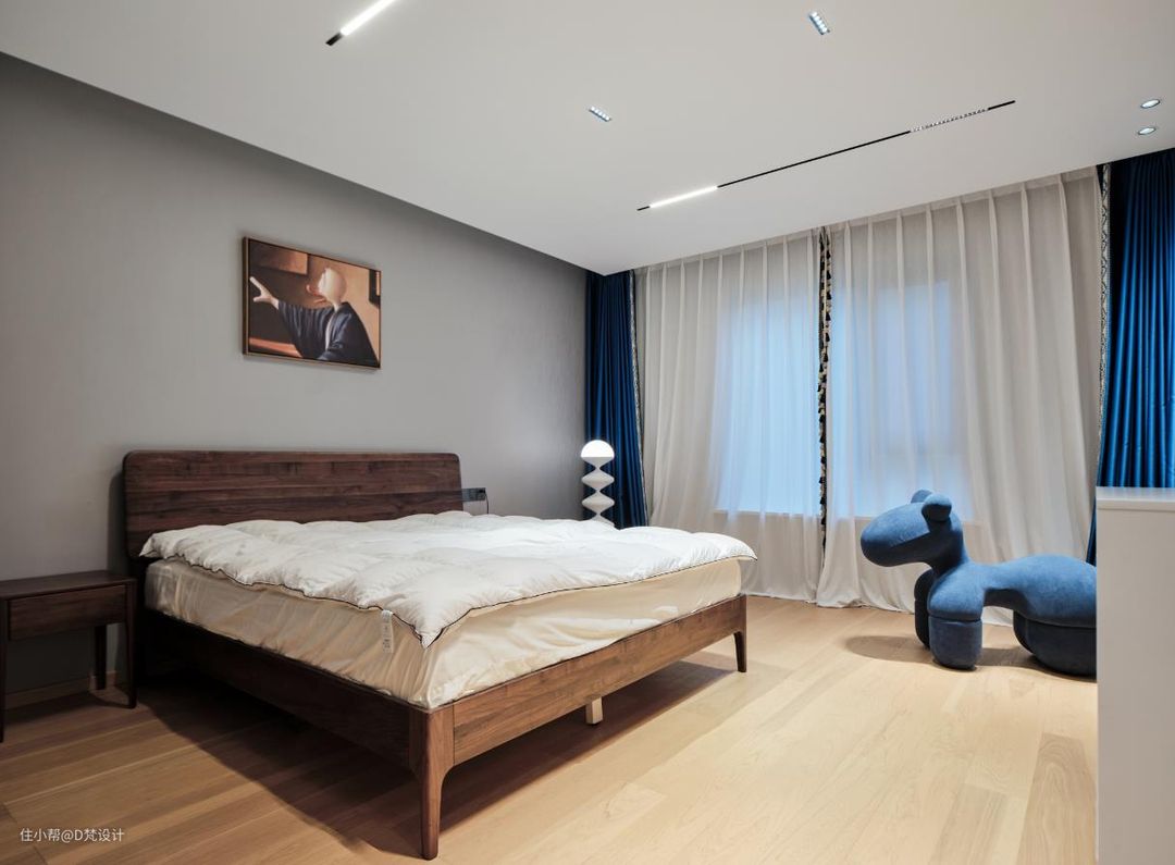 主卧增加木元素的分量,让物的特质带领人沉淀情绪,点缀深蓝色窗帘搭配白色的床上四件套,静谧而美好,沉着与细腻,悄无声息的登场,用弱反光的墙布,模拟柔和的感觉,在清晰的实体世界中,难得片刻模糊。