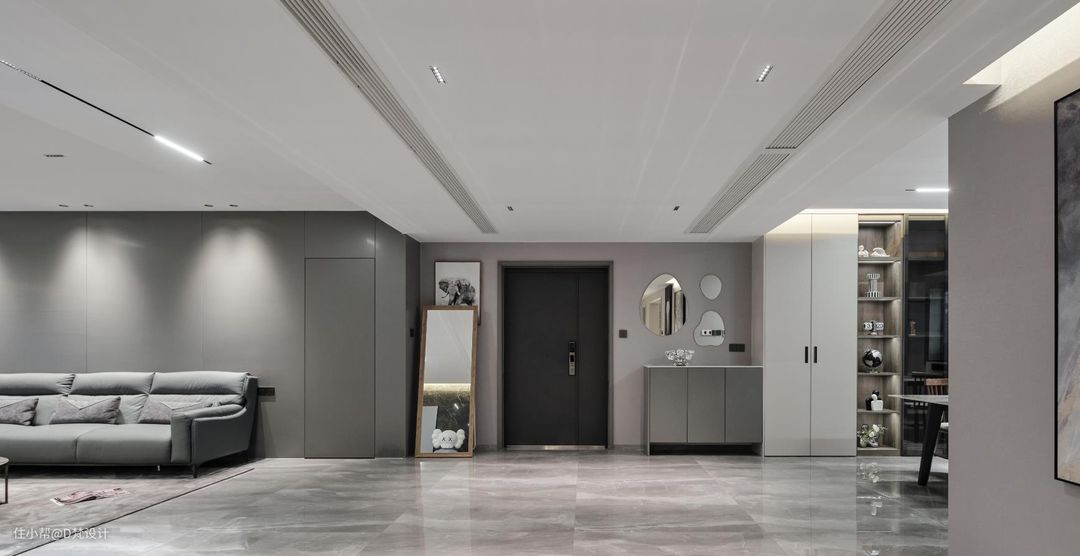 在玄关做了大体量收纳,取用方便的同时还能保持视觉上的整洁,隐形门的设计和墙体完全融合一体,进门就能看到画,作为一道亮丽的风景,不仅可以提升家居环境的格调,还能彰显主人气质。
