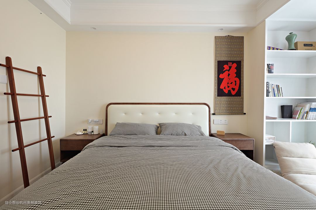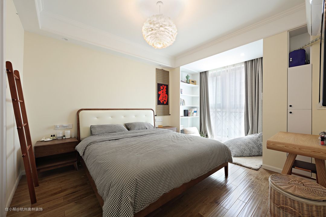 打通卧室小阳台,两边设立书柜,中间改变原传统的书桌方案,将地面铺设地毯和懒人沙发做一个放松的休闲区,打造一个惬意、放松、舒适的卧室空间。卧室实木地板通铺,进一步强调温馨舒适的环境。拉开移门进去便是小型衣帽间了,梯子和衣篓挂放即将要用的衣物,减少了从外到衣帽间的跑动空间,简单实用。因为阳台做了休闲区,取消了梳妆台和书桌放在阳台区域的布置。