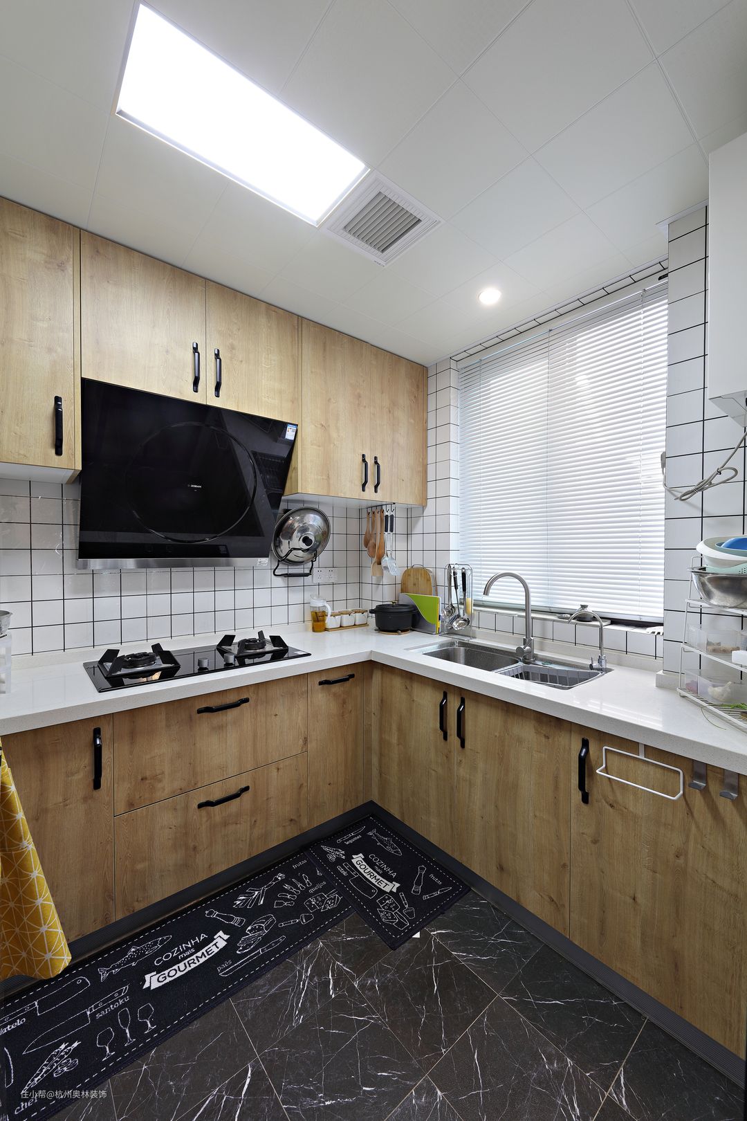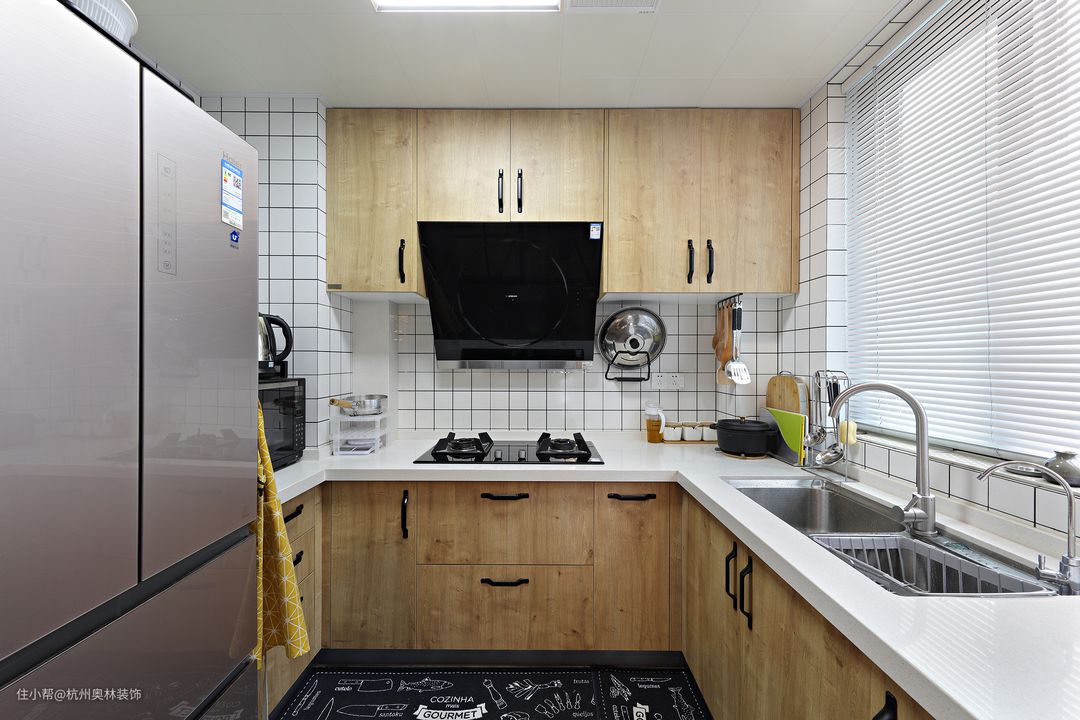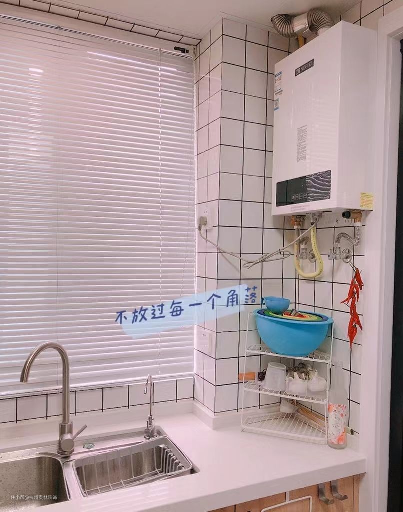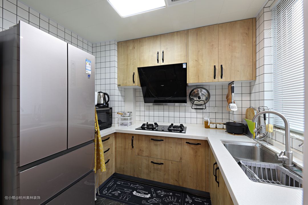厨房的干净与否,很大程度上决定了做饭的心情,所以在厨房空间小,还要放下冰箱,在做到空间的干净整洁的同时,在材料选择上,橱柜也选择了更易清洁打理的爱格板,地板则选择了吸水率低,更易打扫的玻化砖,为了弥补防滑的弱点,在操作区铺设地毯进行防滑处理。