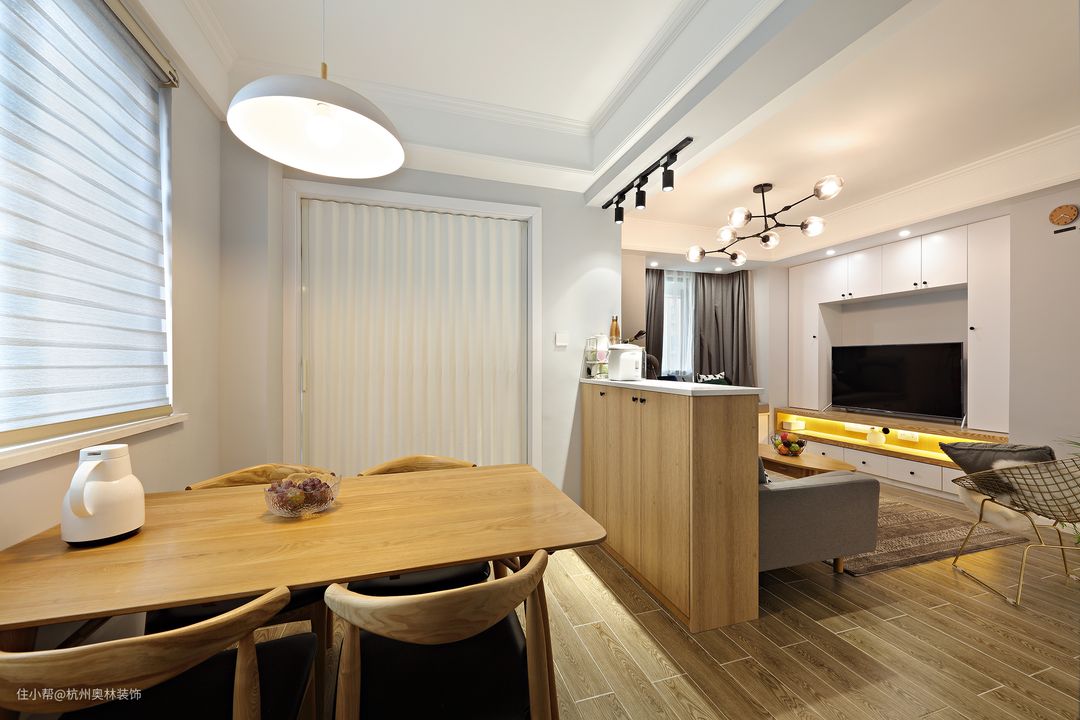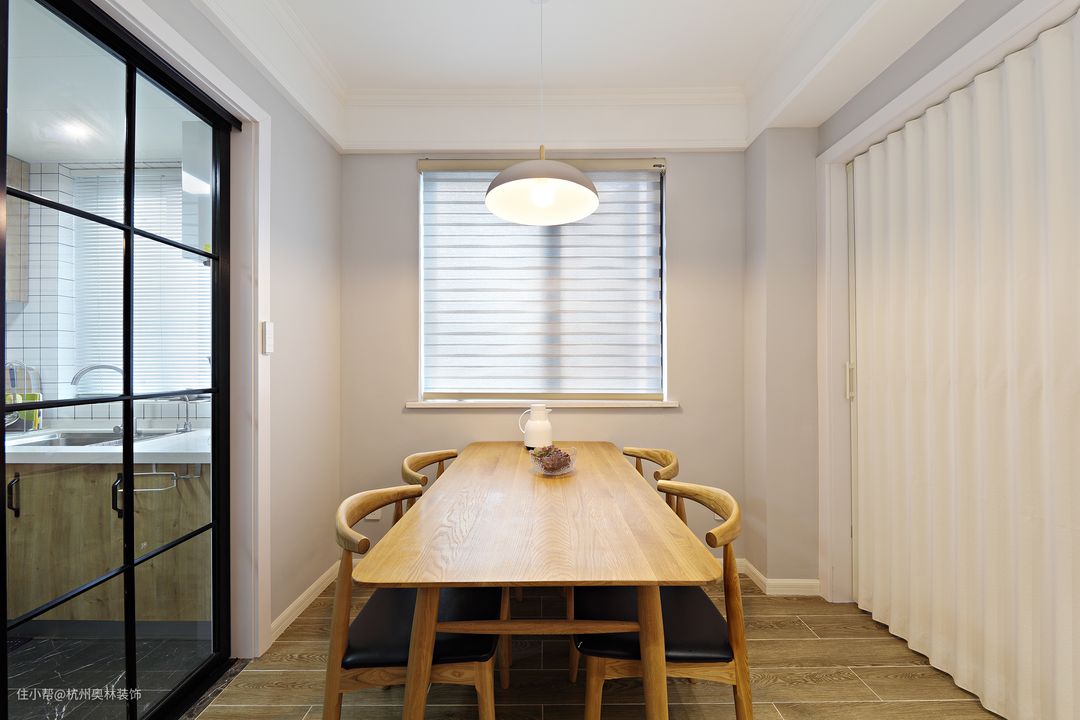 用吧台柜做隔断,完善功能性同时也进一步增加了餐厅的局限性,让餐厅做为一个独立空间感官上会觉得小,所以把餐厅做了极致的简约,避免更多的装饰让空间觉得非常拥挤,同时还在墙体颜色和门框地脚线等颜色做了一个深浅变化,来进一步凸显空间层次感,在视觉上又将空间做放大处理。用实木桌椅除配合空间统一风格色调外,还让其在周边冷色彩中,格外的温馨,加上一款暖色灯光增添氛围。