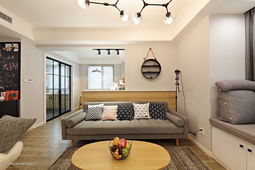 屋主做为小刚需一族,对于房屋最看重的是收纳,其次就是功能实用性,设计师从这些角度出发,针对性的做了设计改造。在进门的左侧做了衣帽间和玄关柜及走廊收纳柜,加上客厅的背景墙的整面收纳柜里填充整个房屋的收纳问题。在客餐厅中间做一个小吧台设计,把阳台做到休闲与生活二分离设计,客厅飘窗做成收纳柜设计,来增强空间功能的实用性。 户型改造重点: 1、客厅飘窗敲掉变为储物柜;电视背景墙也全部做成储物柜。 2、改变墙体位置,留有足够合适的空间,在客厅与餐厅中用吧台柜来做隔断。 3、入户门左侧空间上,新建立衣帽间+鞋柜+走廊储物柜的收纳中心。 4、避开厨房门与入户门相对,选择从厨房右侧做推拉门,与餐厅相结合。 5、西北角的露台,与餐厅打通,搭了个阳光房,三分之二为多功能区,三分之一为生活阳台,中间用移门来隔断,并配上遮光窗帘。 6、餐厅与休闲区用推拉门隔断,将休闲区打造一个真正独立的空间使用。 7、主卧把小阳台包进空间,铺设地毯加懒人沙发,增加卧室休闲空间,两侧设立书架增加功能实用性。 9、卫生间较小,增加储物,对水管进行包柱,平齐空间,在侧面做壁龛。
