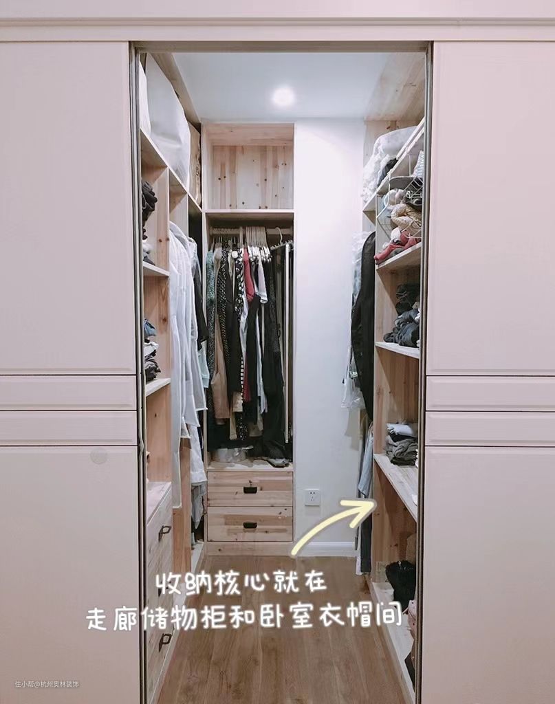 衣帽间则采用移门式,来节省闭合所需的空间,主要以衣柜鞋柜为主。顶层放换季的床上用品被服等。