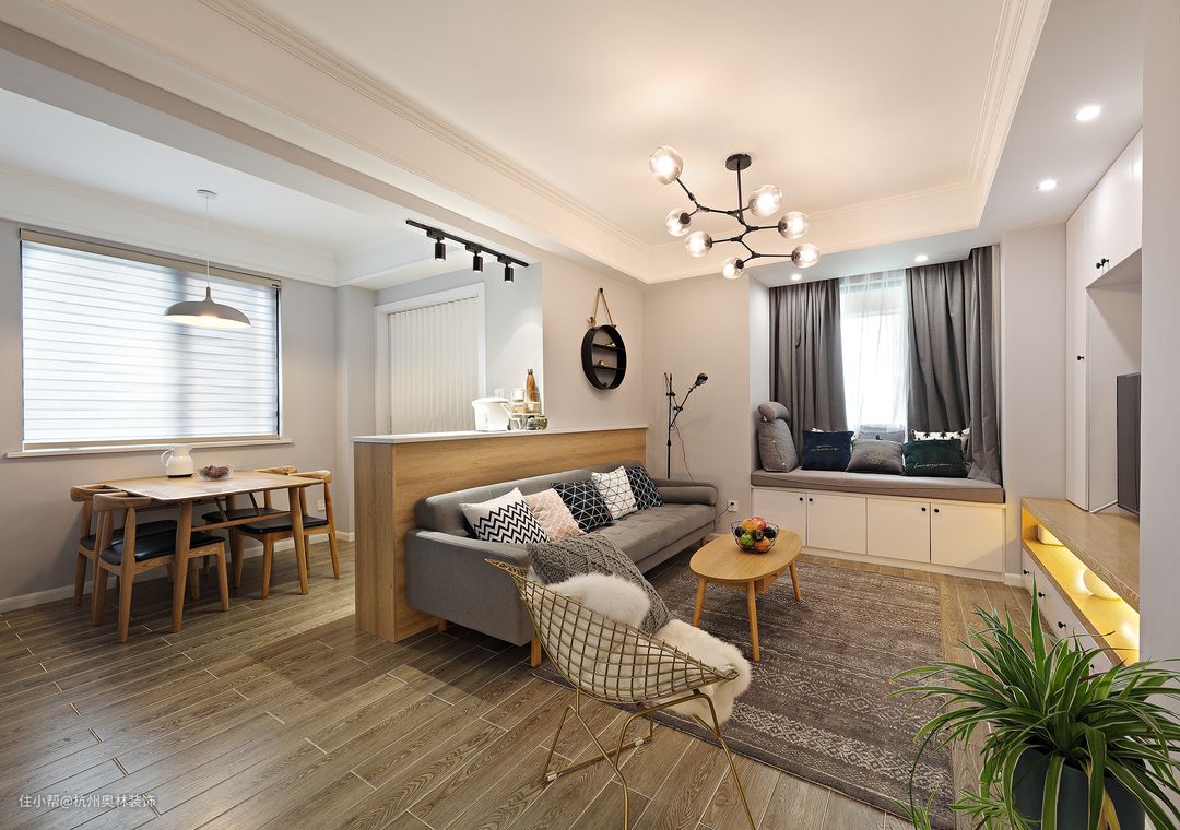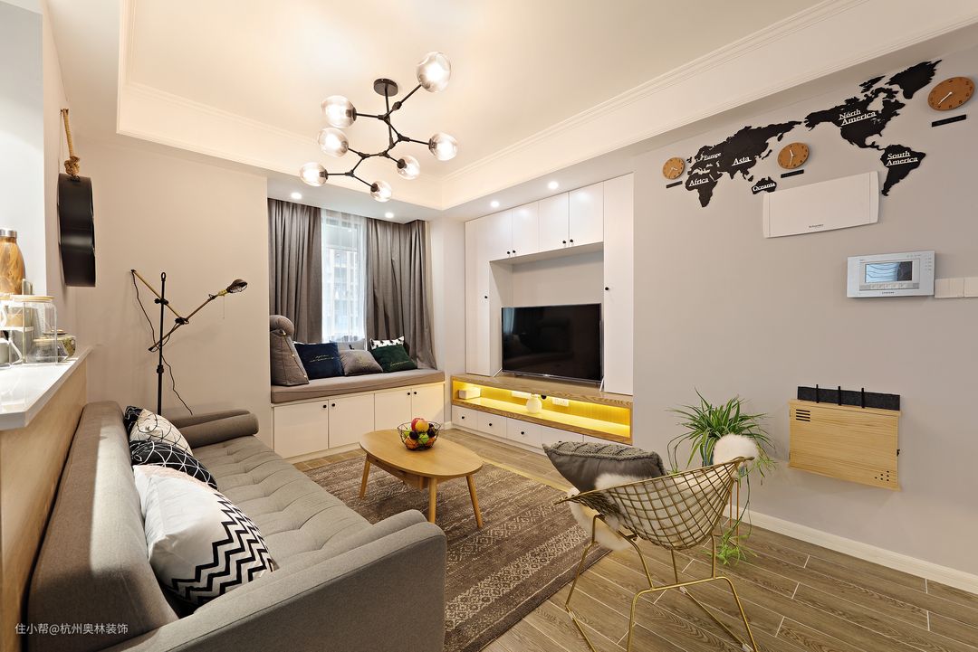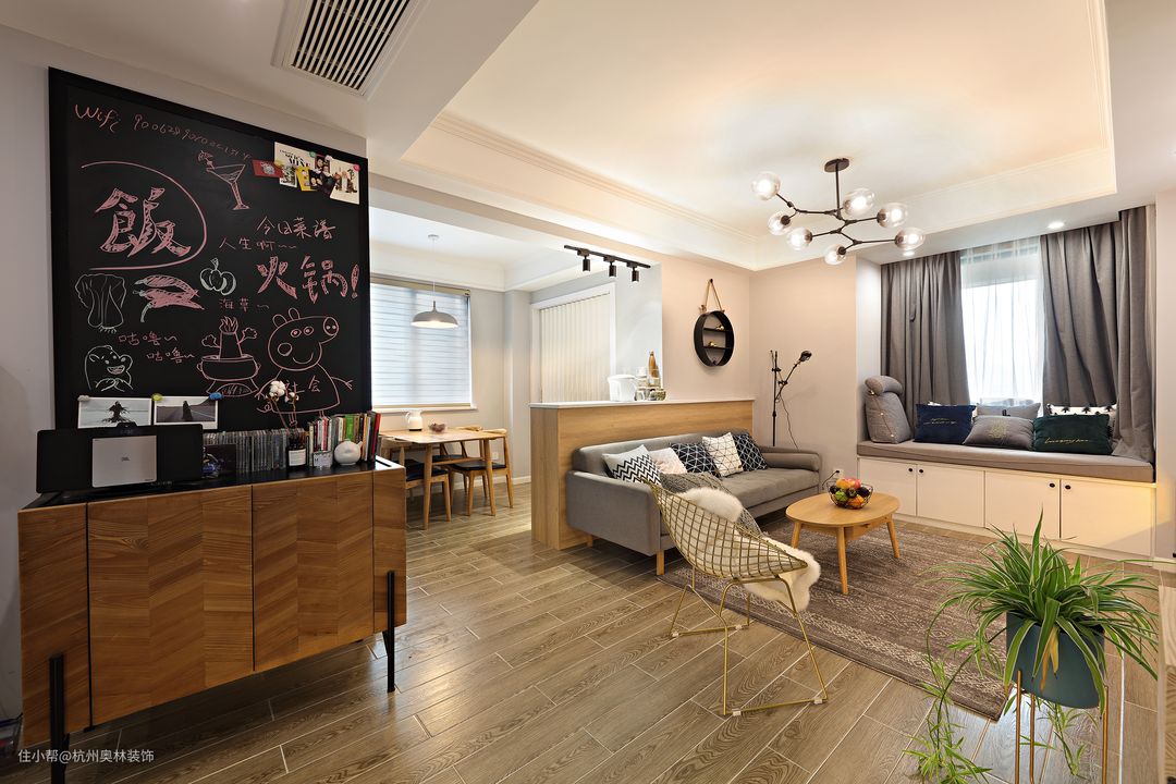 客餐厅来往使用比较多,而且容易沾染油污,所以在瓷砖上选择了地板砖,瓷砖的性能带着木地板的温暖。客厅在灯光的布置上,秉承着人在哪灯在哪,不仅在电视机背景收纳柜和飘窗上,在沙发还选购了一个落地灯做氛围装饰。