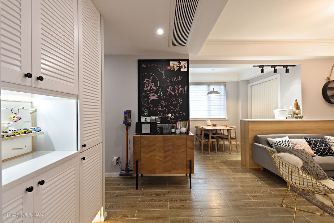 正面选择用一块黑板来点缀空间,用黑板记录居家的日常,或当做照片墙记录生活中的点点滴滴,提升了家庭的幸福感。玄关柜用镂空背景选择了洞洞板,可以放一下可爱的小玩具,增添色彩。