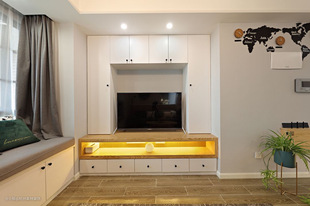 原客厅电视机背景区域是有一个小的凹陷,改造规划中选择用收纳柜将空间填平,电视机镶入在收纳柜中,下方又选择做电视机柜来解决生活使用。墙面的延伸把空间放大,指向飘窗,贯通内外。