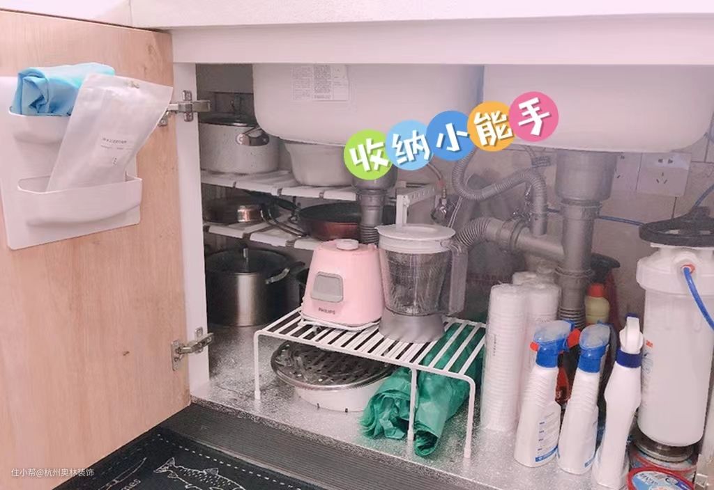 隔壁地柜空间堆放的是不常用的锅,水槽下面是放日常需要使用的清洁剂。