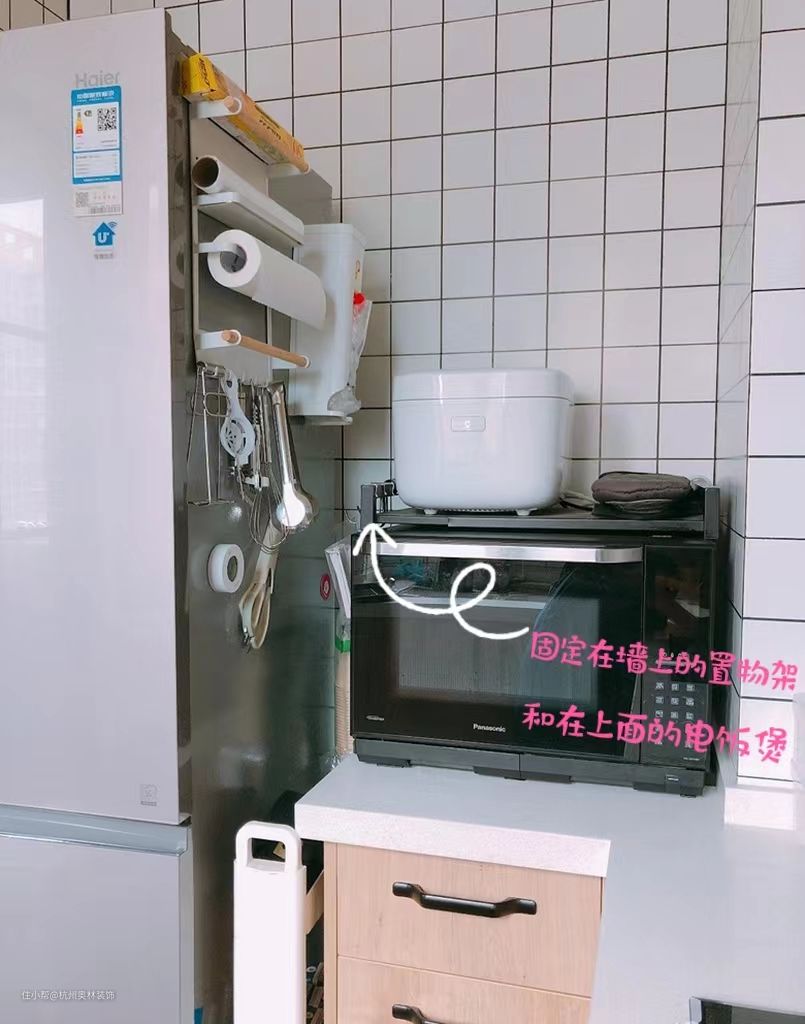 冰箱侧面放便利的厨房纸,保鲜膜和厨房的收纳,侧面是以微波炉顶面2cm为界限,做了一个置物架,放电饭煲,冰箱与台面空隙放一个小移动式置物架。