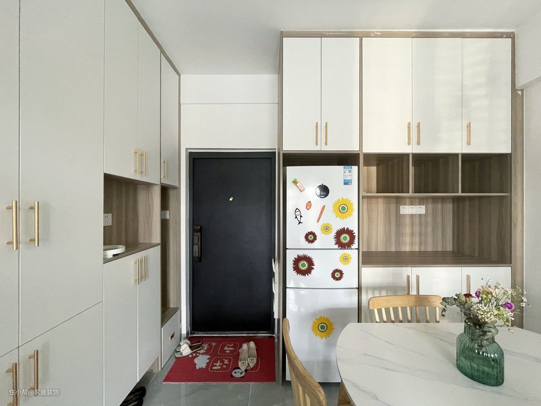 入户左侧设计鞋柜、储物柜一体式让空间整体性更好,也解决了小空间的收纳问题。鞋柜区域在中间做了一排镂空设计后期进门放包和钥匙之类的东西,同时右侧餐边柜的颜色与鞋柜相统一,并通过白色柜门作为过渡,运用色彩将空间更好的融为一体。
