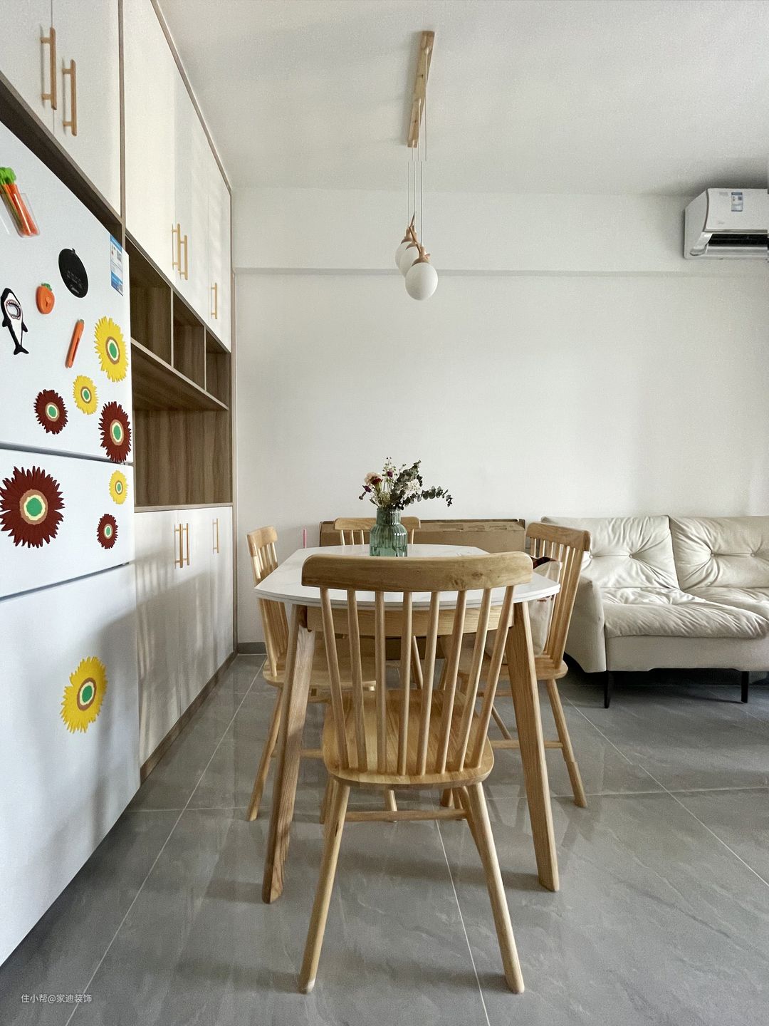 餐厅靠近入户,与客厅间互动性良好,连通无界,岩板原木餐桌搭配同色系的原木餐椅,打造烟火十足又雅致清新的用餐氛围。花朵隔热餐垫,不使用时可磁贴在冰箱门上,点缀家居之美功能多样,环保安全清新简约风。