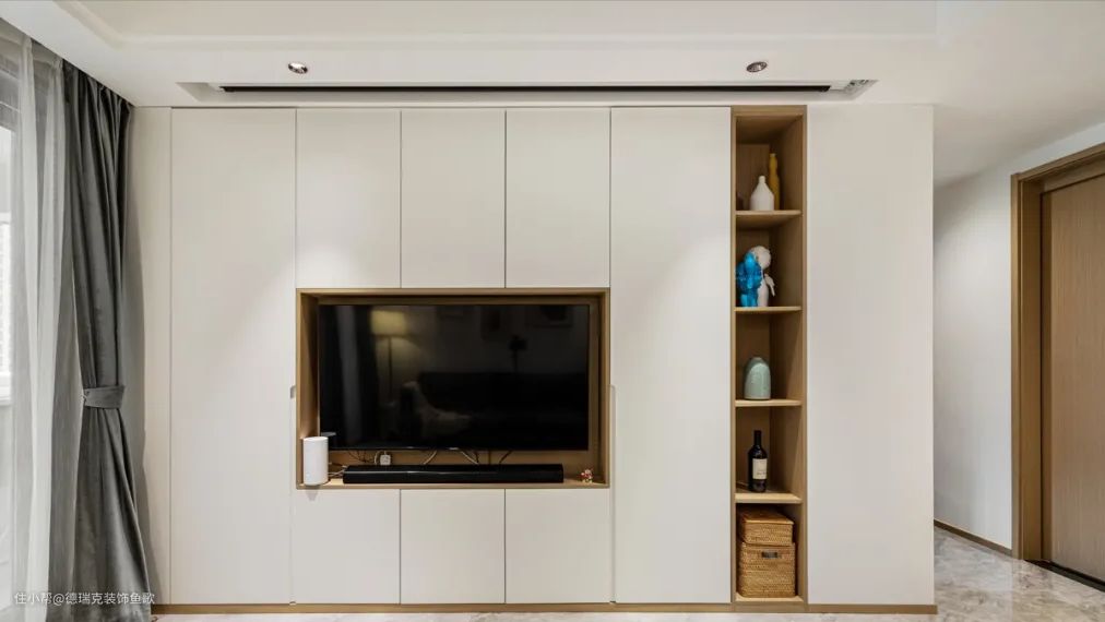 整墙的电视柜,电视机采用嵌入式设计,既不占用额外空间,也保证了柜子整体的收纳性。
