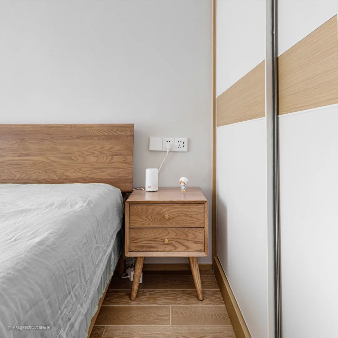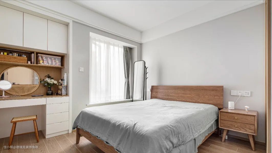 主卧以白色调为主,搭配原木家居,温馨又耐看。飘窗提供大量采光,临窗设计全身镜,方便整理着装。