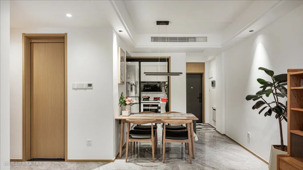 餐厅设置在厨房出口处,充分利用空间,而且缩短餐厨距离,动线更流畅。原木餐桌椅休闲又舒适,搭配线性吊灯,营造良好的用餐氛围。