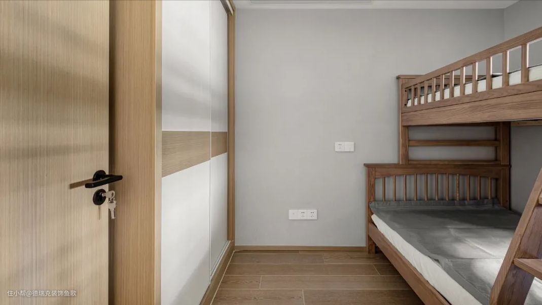 次卧改为儿童房,上下双层床设计,大大增加空间的利用率。除此之外,儿童房还布置衣柜、书柜、书桌等,学习和休息都兼顾。