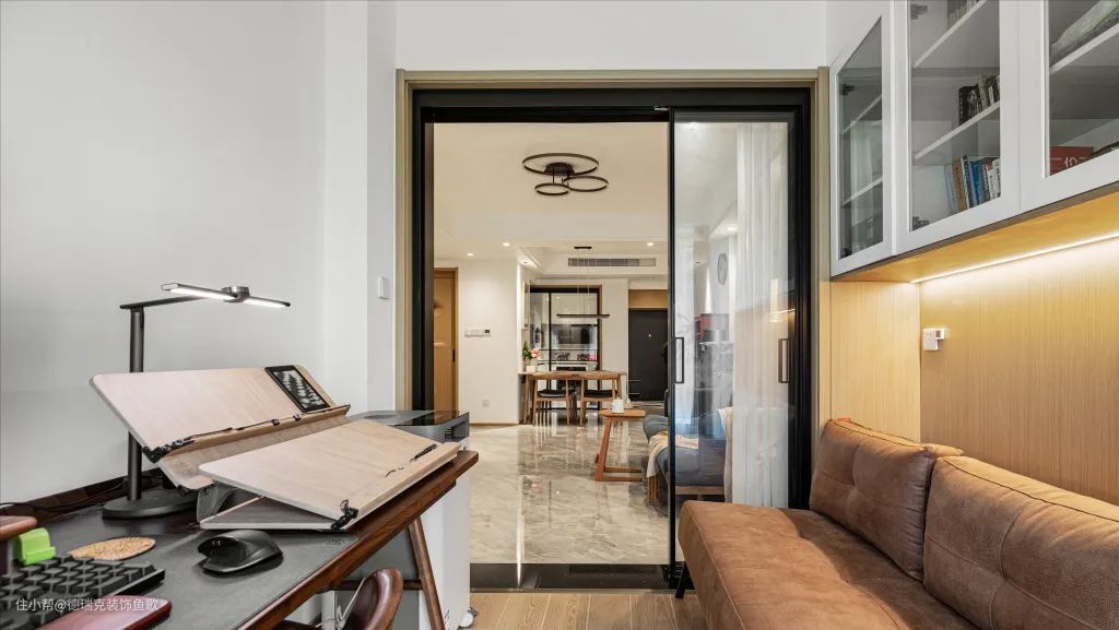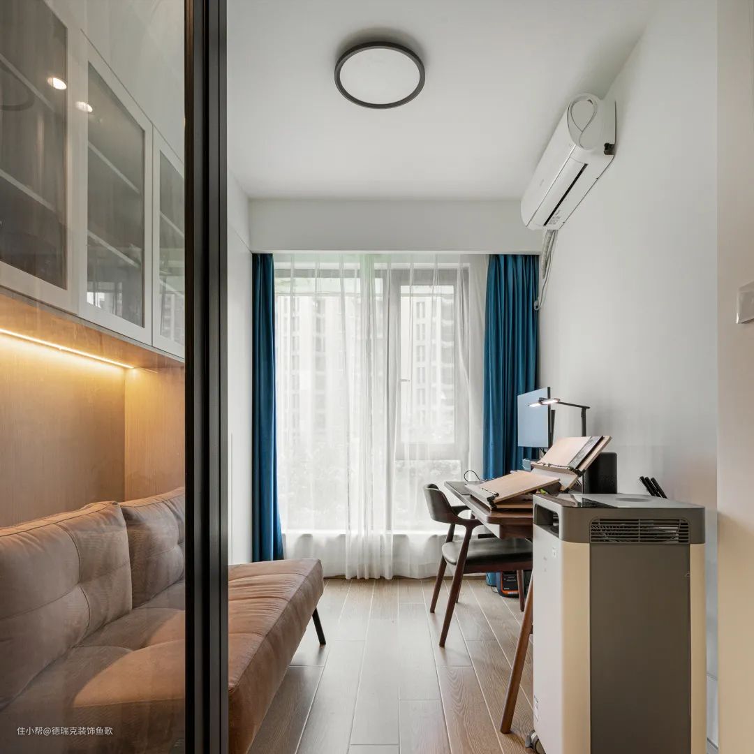 阳台改为书房,三联动的玻璃移门引入采光,空间通透明亮又大气。而且书房作为一个备用空间,既方便业主办公学习,也可以充当临时客房,一举两得。