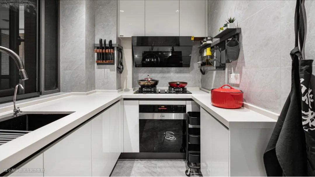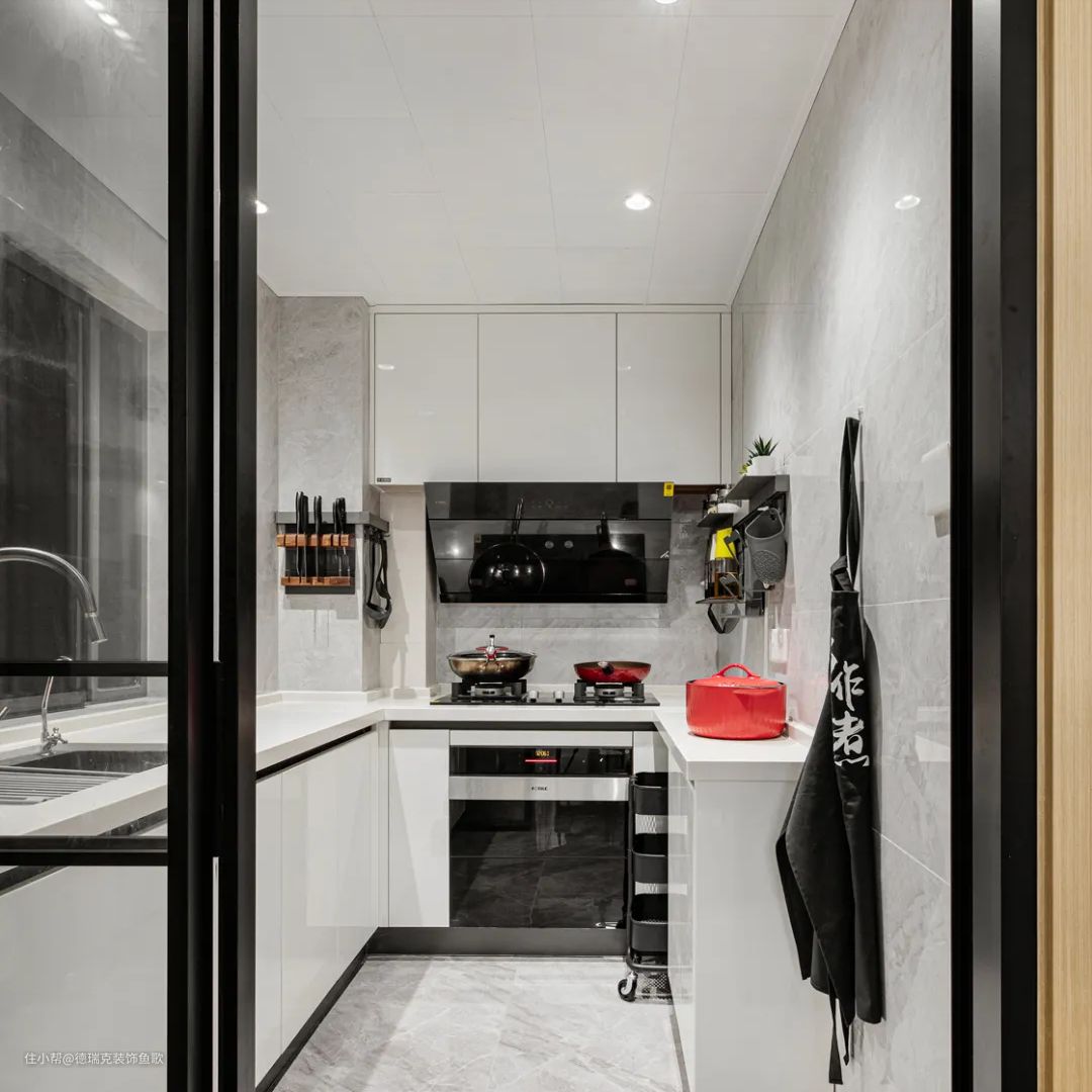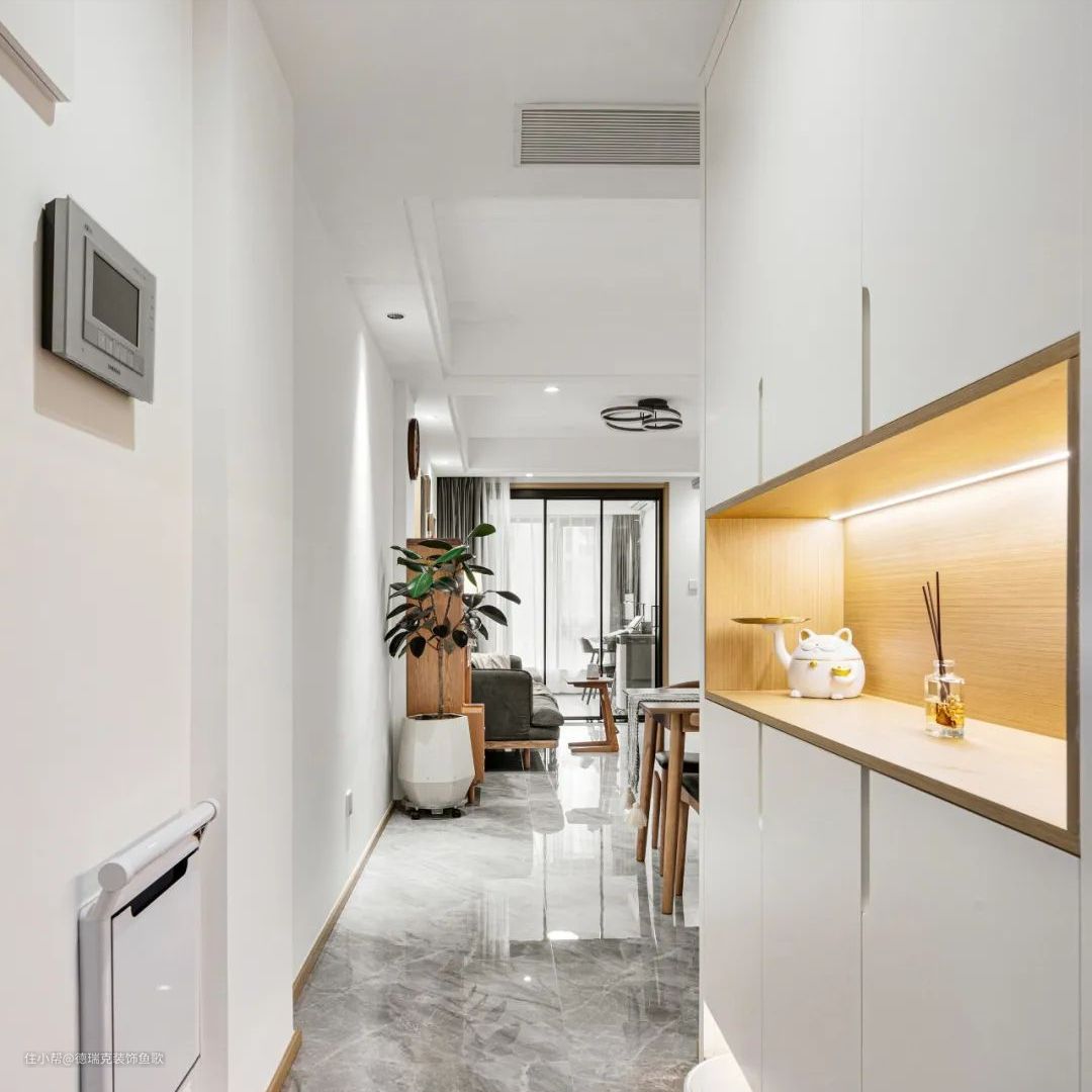 原入户空间狭小,设计师改变厨房门方向,加强空间光线和动线的连贯性。入户处设计鞋柜满足收纳的需求,中间镂空嵌入灯带,打造回家的仪式感。