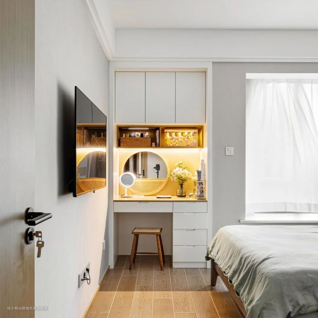 主卧衣柜采用嵌入式设计,收纳空间充足。通过主卧与阳台的结构改造,嵌入梳妆台组合柜,搭配灯光设计,精致又实用。