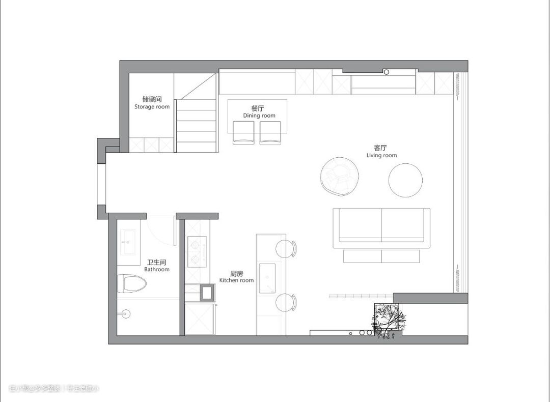 一层平面布置图 1.一层把原来的厨房位置改成了洗手间,避开餐厅区域,卫生间门采用了极窄铝合金超白长虹玻璃门来解决采光的问题,暗卫通风问题通过类似新风一样的原理来解决,本文最后有详细说明和图例。 2.原来的鞋柜收纳柜只能做一半,通过做整体旋转鞋柜来解决鞋柜收纳空间不足的问题。 3.电视背景做了一整排的收纳柜一直延伸到餐厅区域变成可以收纳的卡座。 4.厨房做了开放式厨房,增加了与客厅之间的联动性。 5.客厅拆除了原有采光井墙面,不仅增加了厨房的使用面积,而且客厅也比原来视觉更加宽敞明亮。 6.为了遮挡空调外机和室外燃气热水器,在室内一侧做了一棵景观假树,来弱化设备接线的杂乱无章。