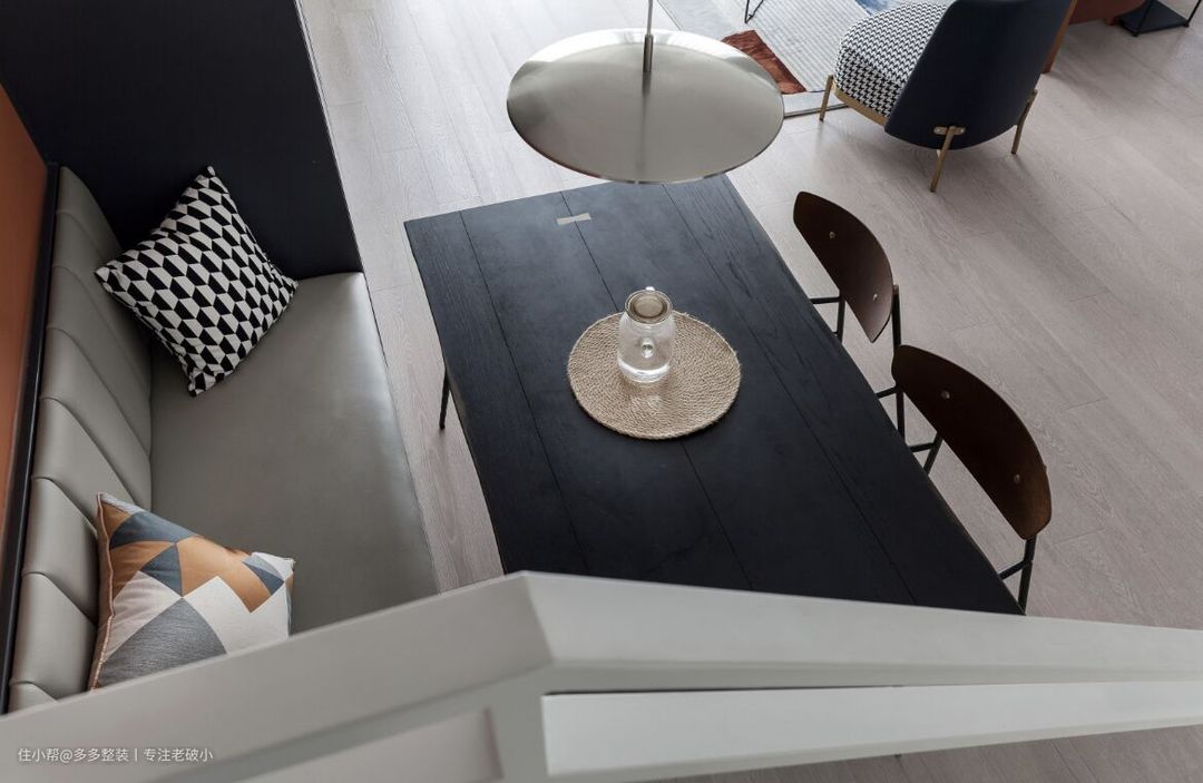 从二层楼梯转角处看餐厅卡座视角,这样布局的好处是当家里吃饭人数增加时,餐桌可以临时灵活调整摆放位置,平时这样摆放又不占用空间。