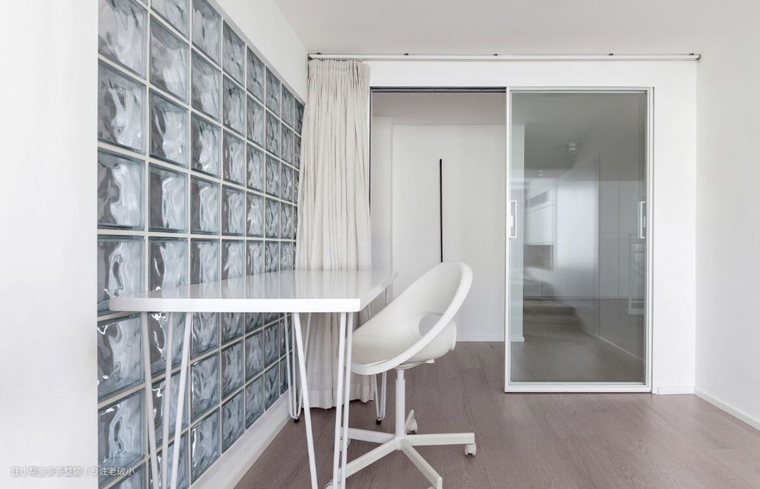 儿童房其中一面墙也做了玻璃砖,原来挑空部分的自然光也可以补充到室内,同时也会照射到公共区域过道。