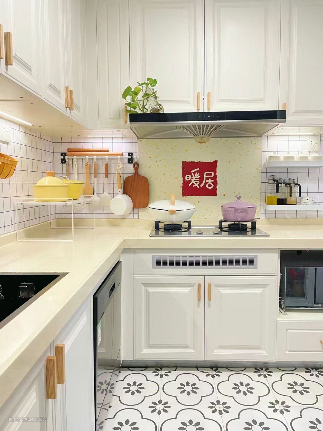 厨房只有3平米,做了L型设计,上方做了吊柜增加收纳空间,日常用到的调料和工具,能上墙就上墙,不占地方,也显得厨房干净整洁,厨房再小,也能五脏俱全。