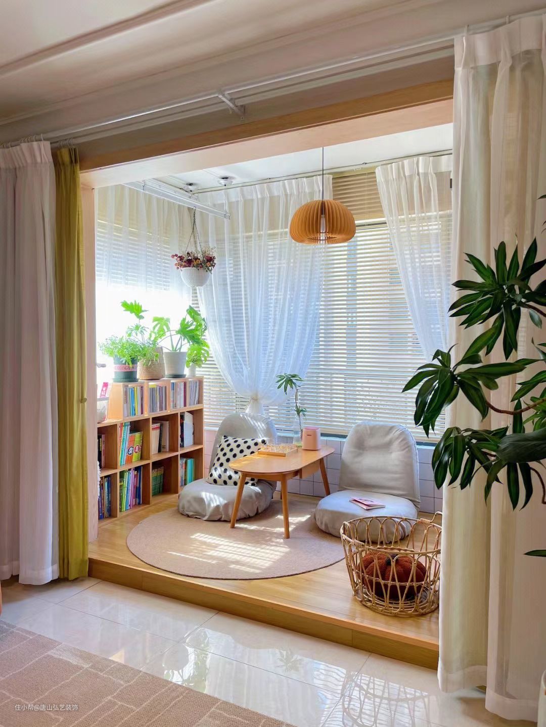 阳台改成读书角,加高12cm地台,铺上木地板,窗帘用双层帘,一层百叶窗,可以根据光线进行调节,一层柔沙,避免阳光直射,书本放在随手可拿的范围内,避免来回跑动,氛围感拉满。