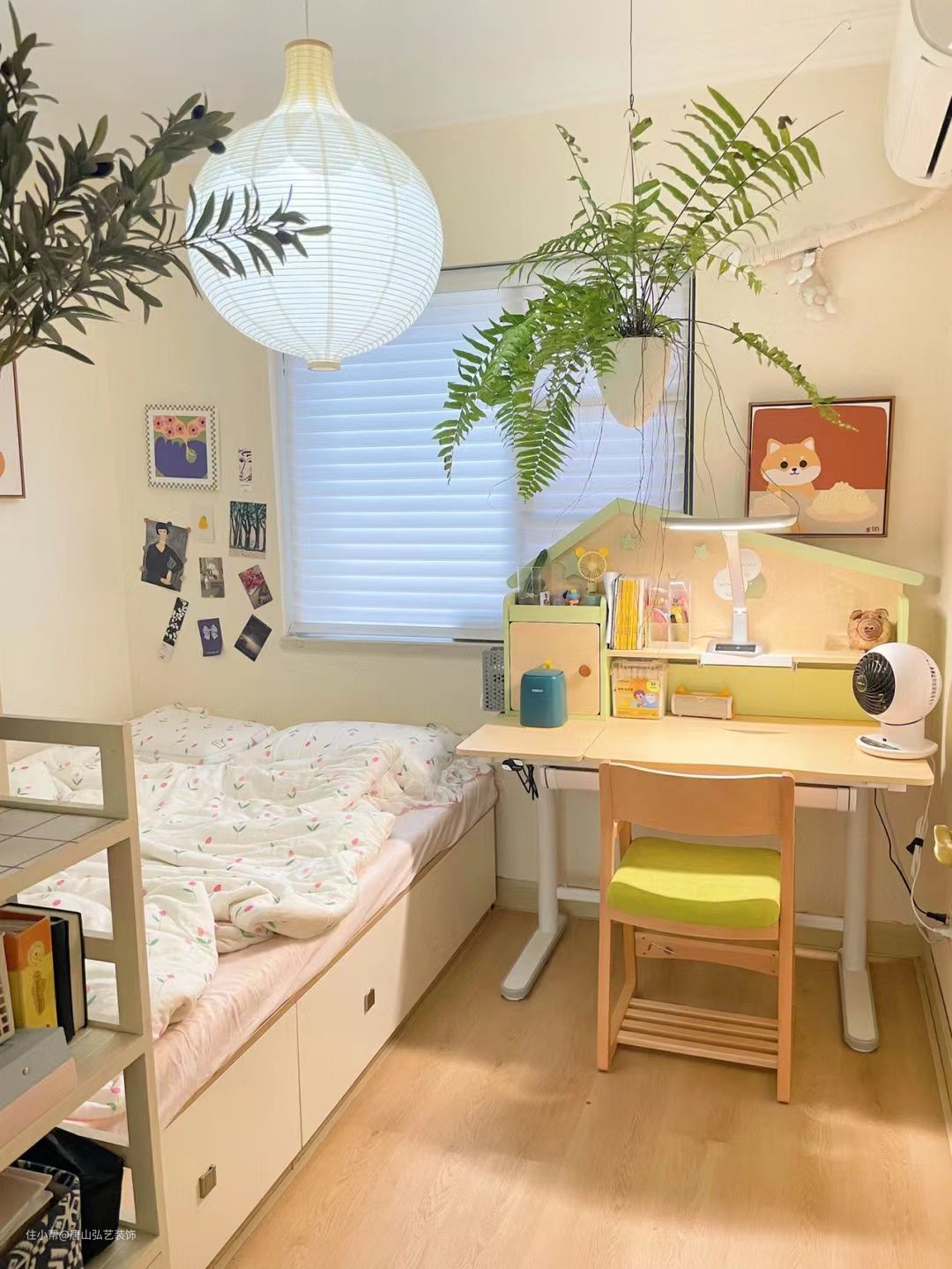 儿童房通刷暖黄色乳胶漆,书桌和学习椅作为呼应,都带着暖黄色调,再配上绿植,房间亮度一下就提升了。