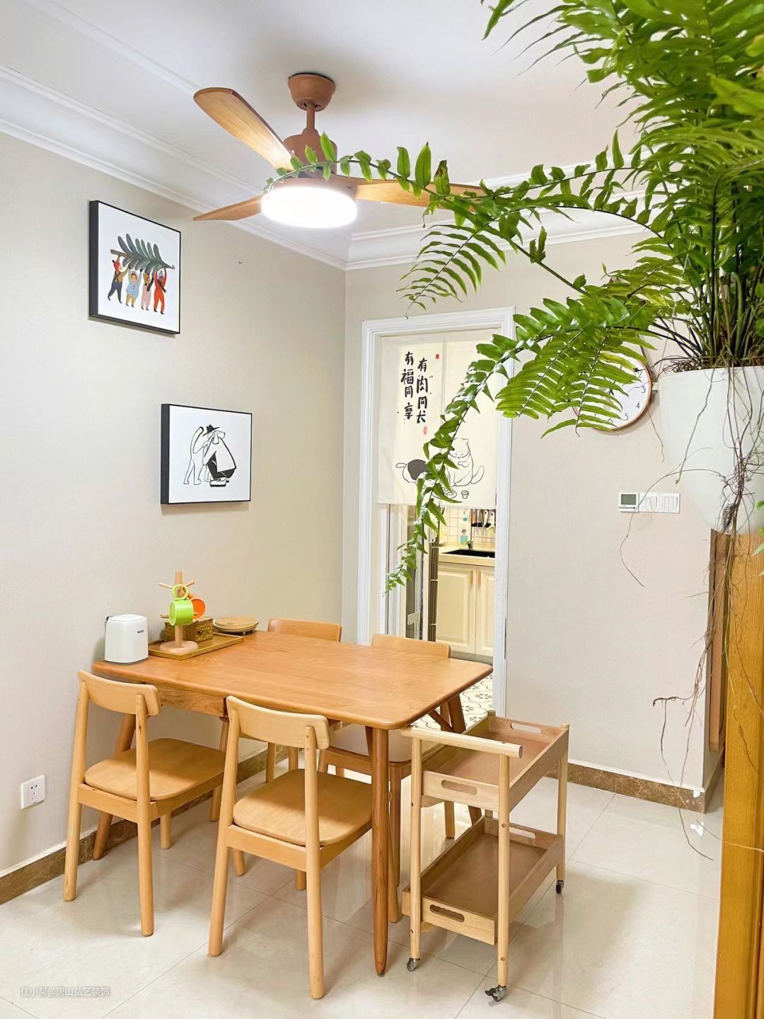 餐厅选择了给人温润感的原木桌椅,用简单的装饰画进行点缀,简单好看又实用。