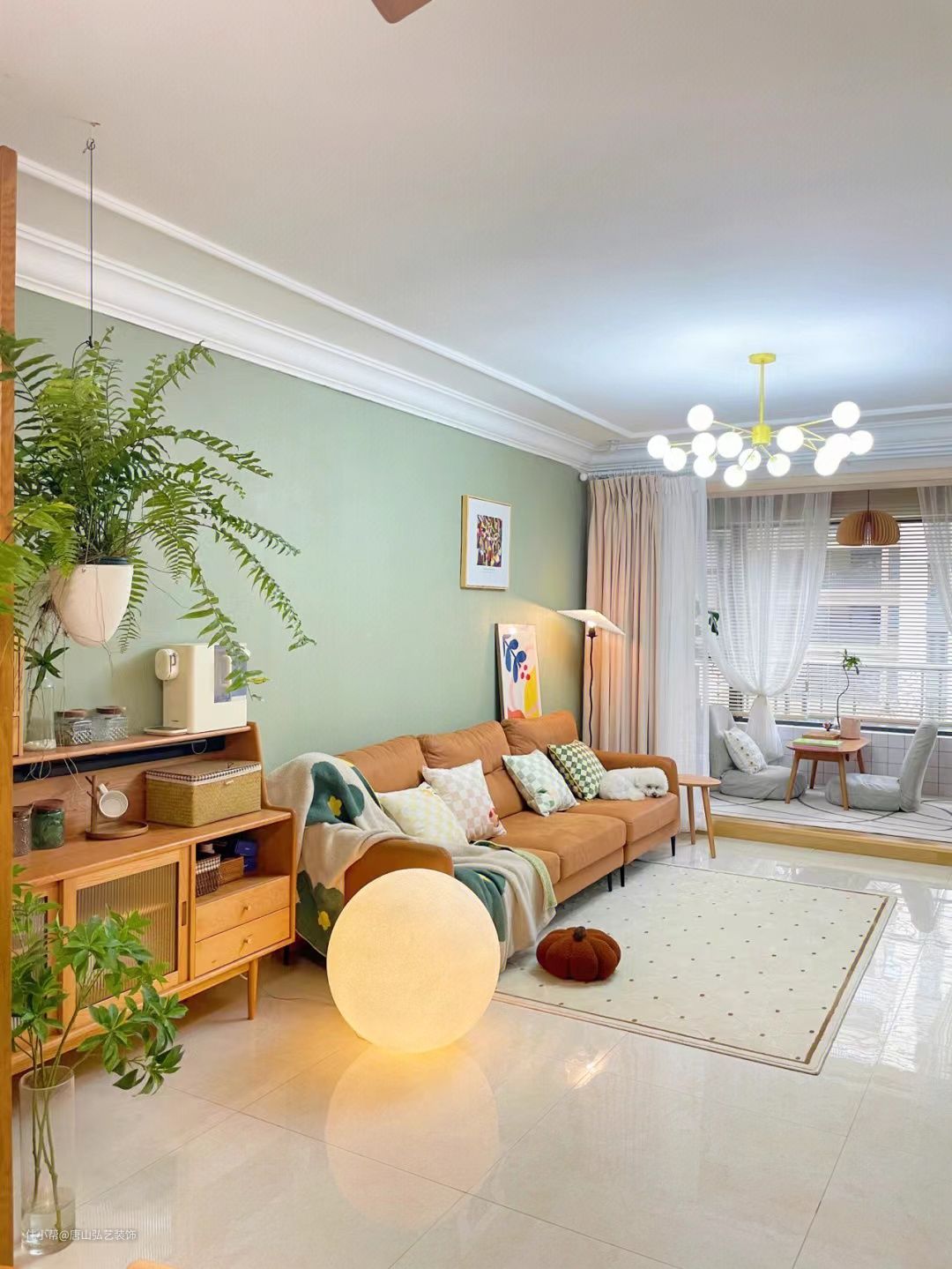 客厅选择浅色系地板砖,不突兀,不抢镜,为搭配留足了空间,原木色收纳柜,棕色沙发,搭配上浅绿色背景墙,妥妥的原木风氛围。