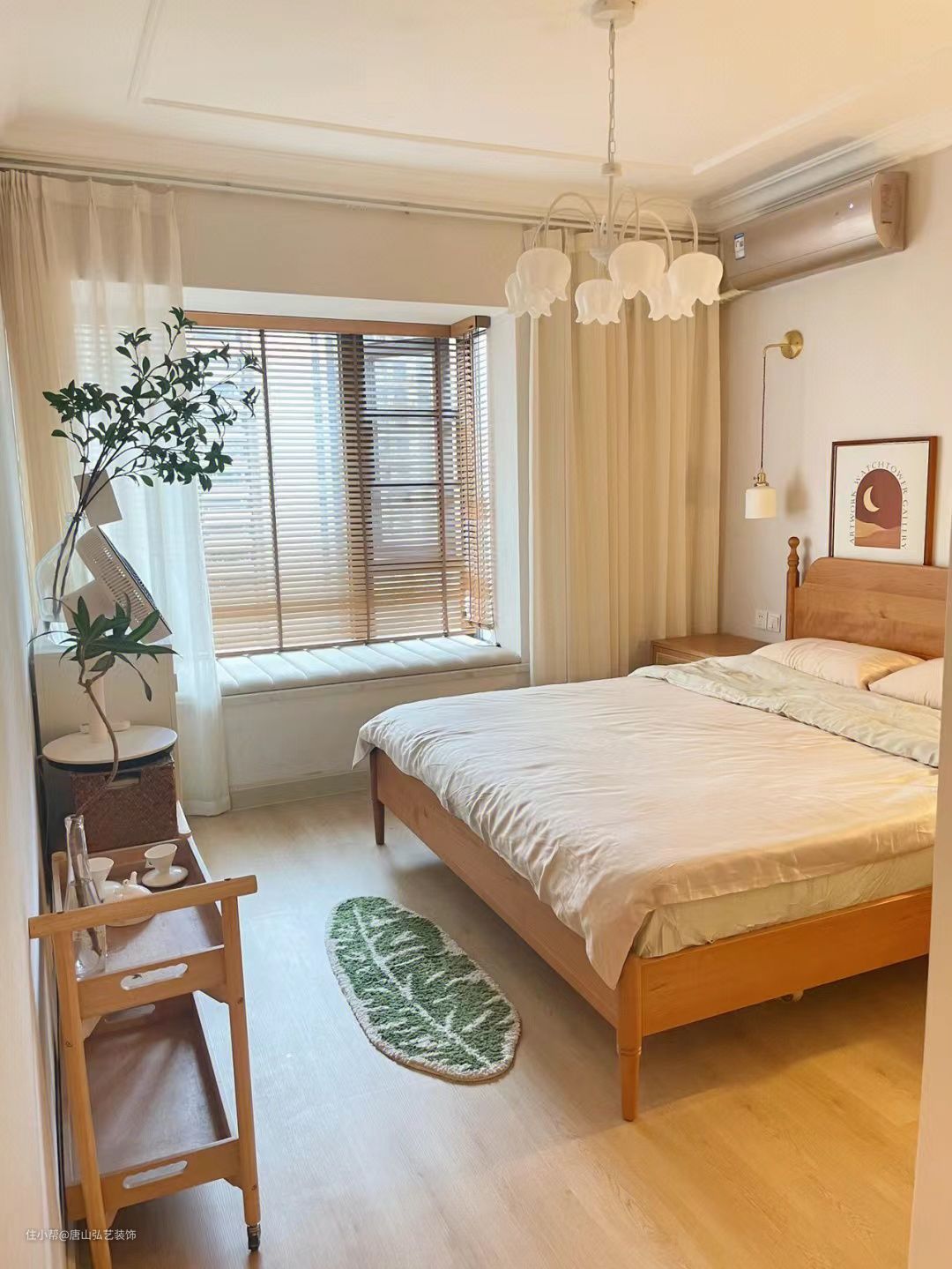 主卧添加了跟多复古元素,铃兰花吊顶,樱桃木的床,原木地板,雨棕色木百叶,配上纱帘,充满了电影中的复古色调。