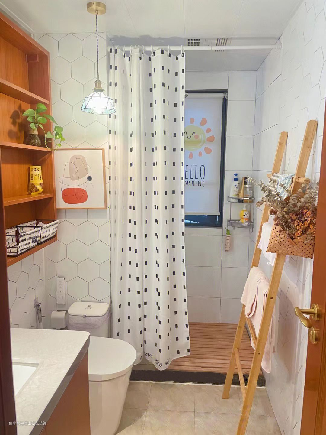 卫生间用浴帘来区分干区和湿区,原木色收纳柜,配备浅色岩板,干净又清爽,淋浴区抬高,采用原木踏板,美观又实用。