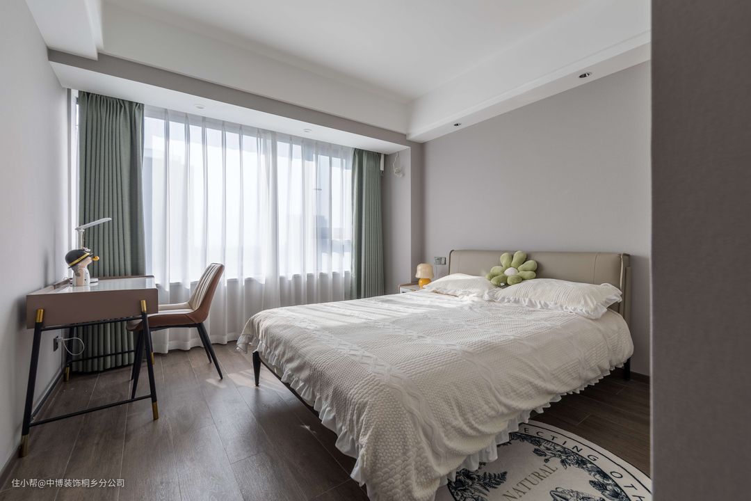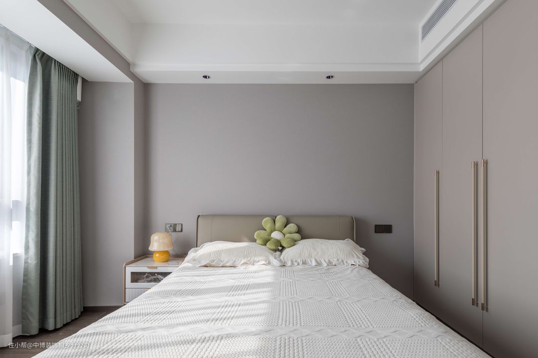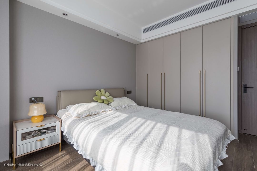 卧室以现代极简的空间,木纹地板+白墙以及天花吊平顶+无主灯的设计,布置棕色皮艺床+黑白格床单,营造出一种简单舒适而实用的卧室氛围。