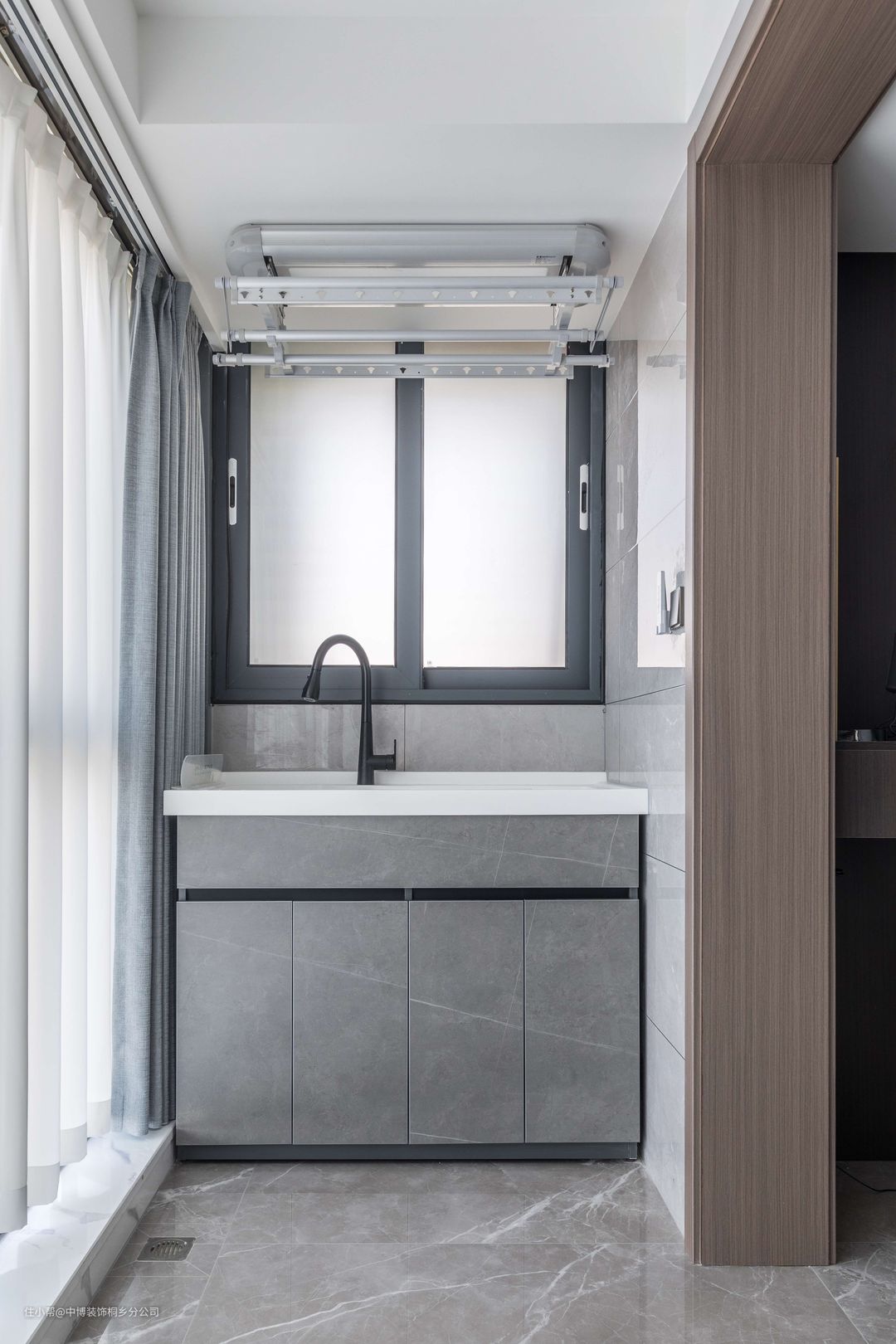 生活阳台一边设计有洗手台和自动晾衣架,另一边则是洗衣机与橱柜,此外还设计有挂钩,用来悬挂部分打扫用具。
