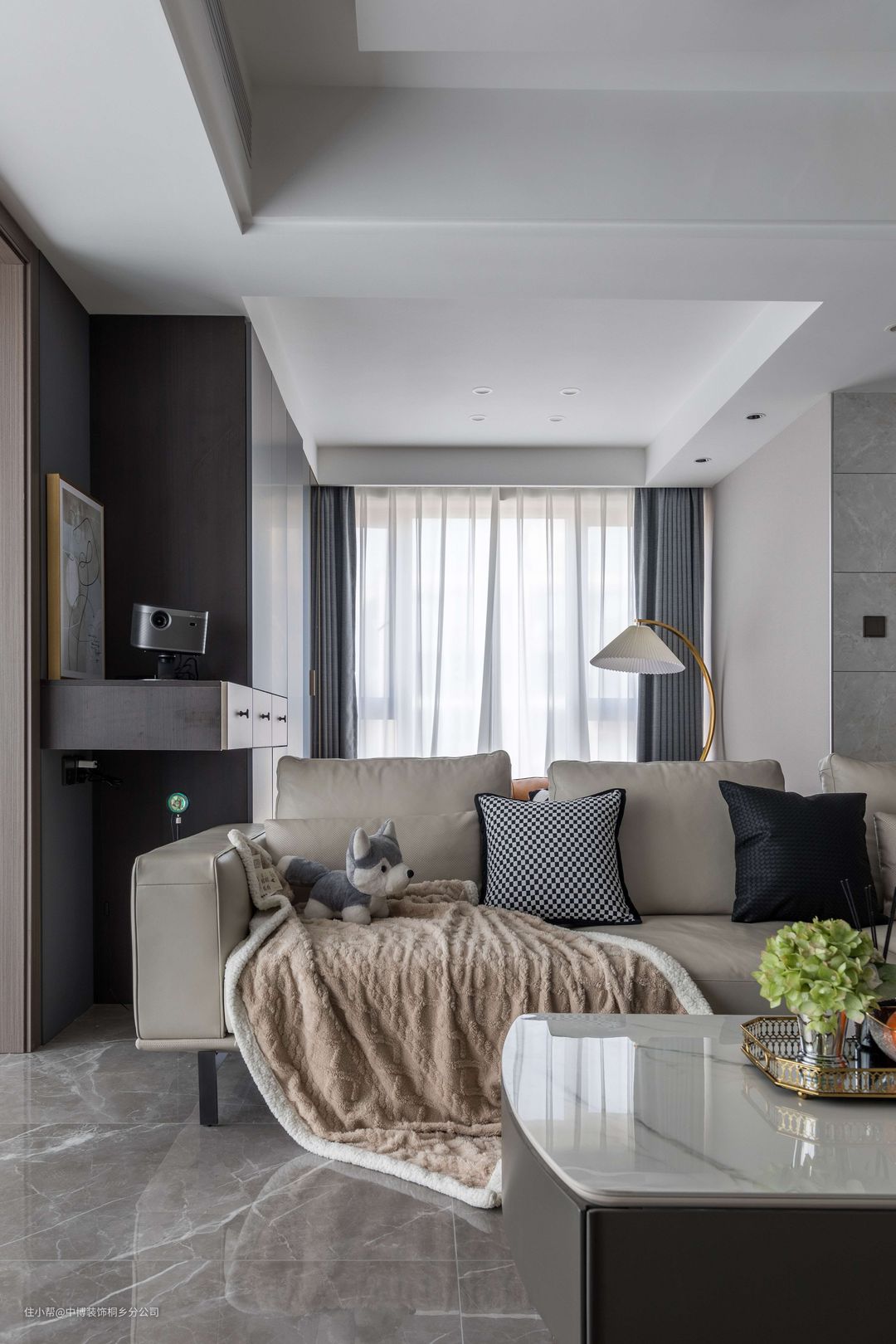 客厅整体硬装以净白为主,而沙发与茶几等家具则是浅驼色搭配为主,整个空间显得现代时尚而极简高级。壁挂电视采用的是黑纹白底的背景墙,与电视柜统一款式。