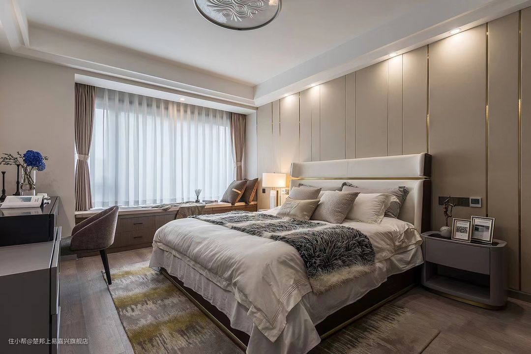 父母房床头墙是咖色的硬包背景墙,灰色的皮艺床,简约小巧的床头柜搭配精致小巧的摆件,一旁的落地窗采光非常的不错,整体给人的感觉就很温馨舒适。