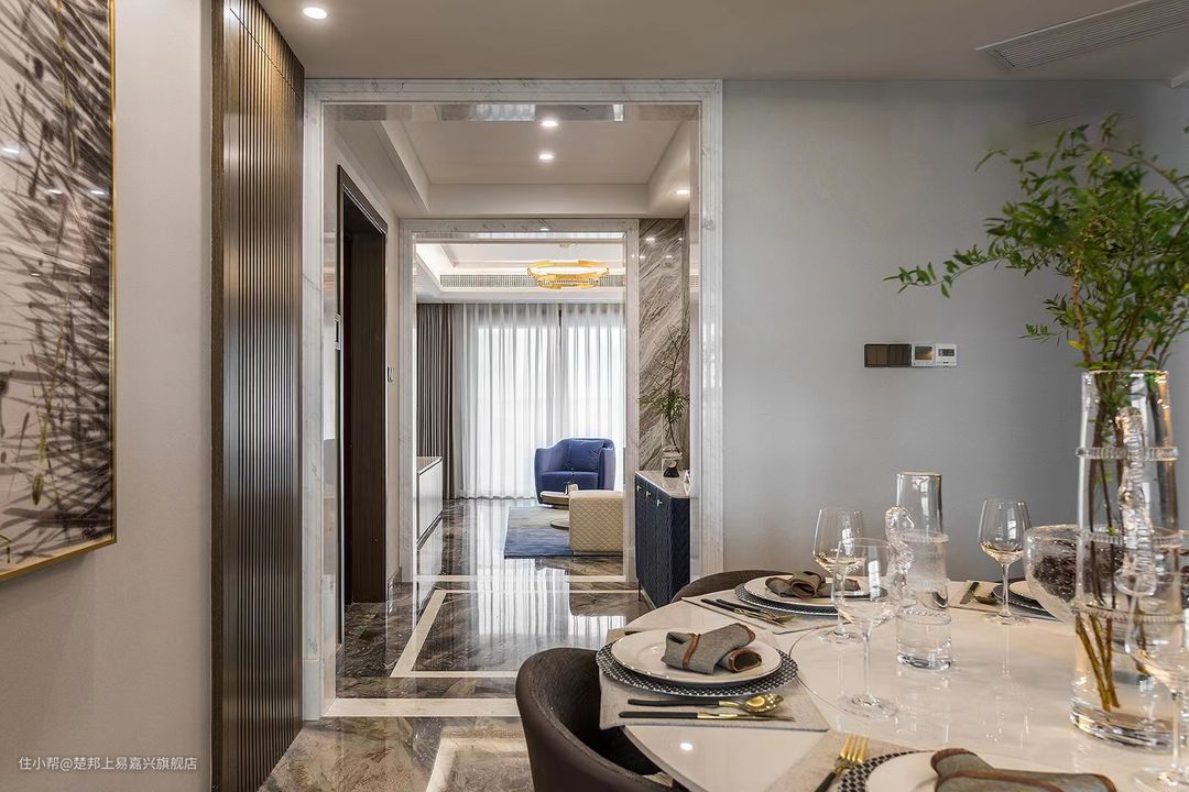 轻奢精致的餐桌椅,在金属、石材与布艺质感的结合搭配下,呈现出一个华丽高级的用餐空间。