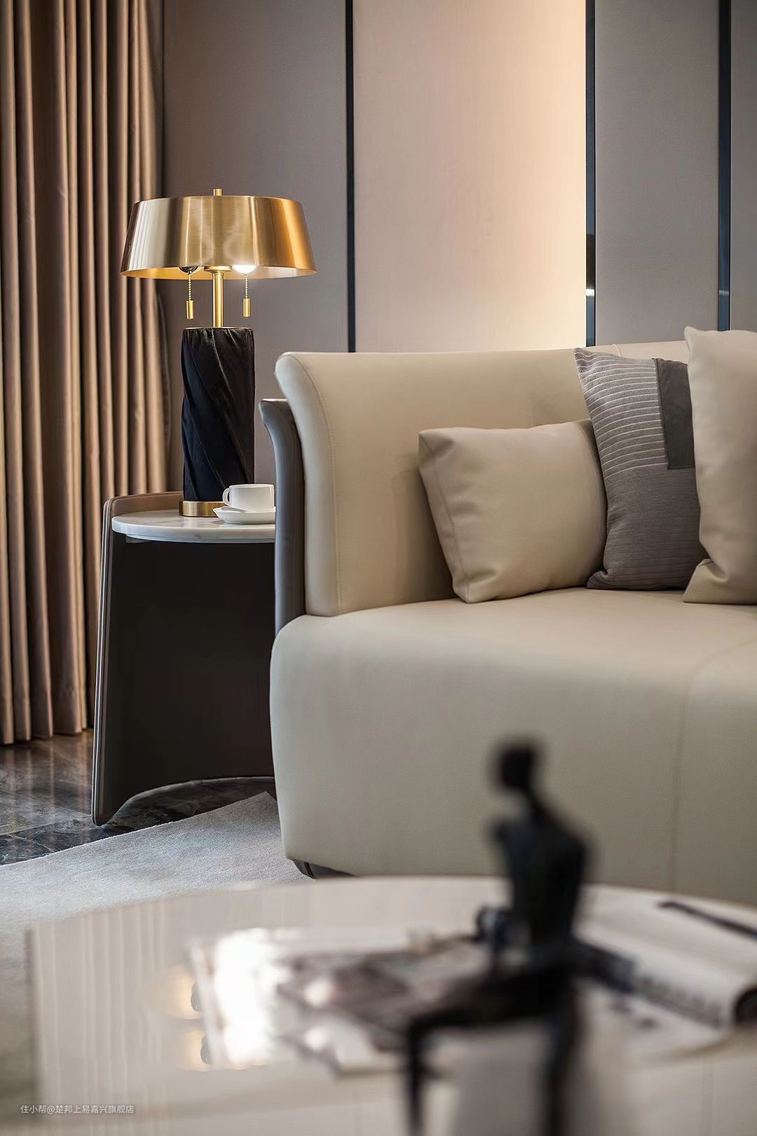 浅灰色的布艺沙发,还有大理石台面的金属架茶几,茶几上布置华丽精致的摆饰品,呈现出一种优雅大方的自然与端庄感。