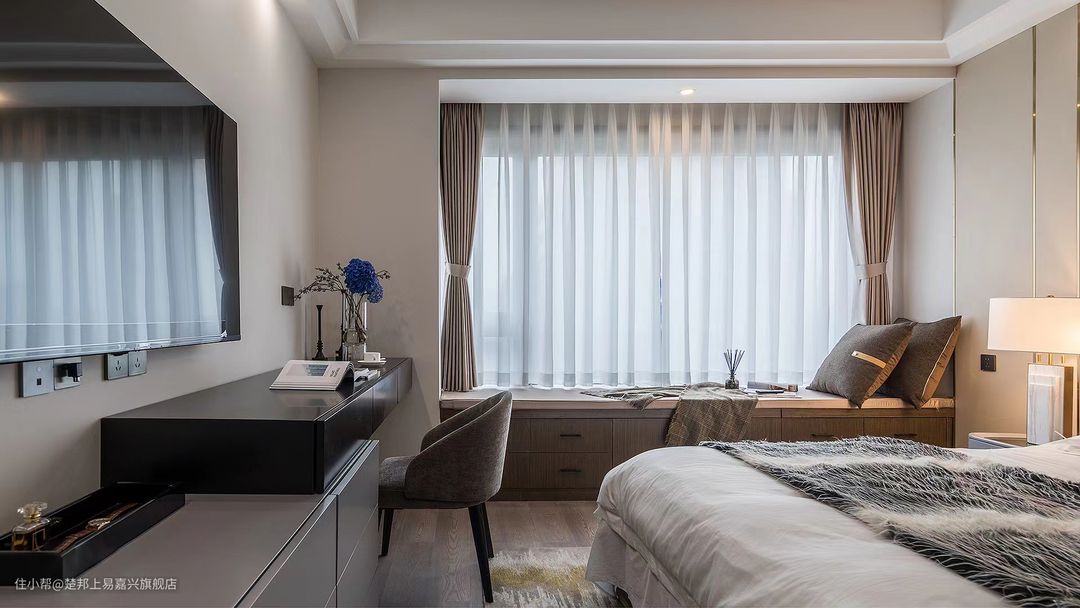 床尾放着电视机,成品的柜子和化妆桌成了卧室很好的装饰,也为女主人梳妆打扮提供了舒适方面的空间。