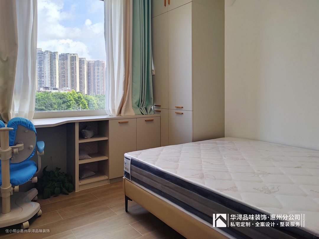 儿童房临窗设计了一套组合书柜与衣柜,光线良好,适合日常学习阅读,满足日常收纳,也给孩子提供休息的空间。
