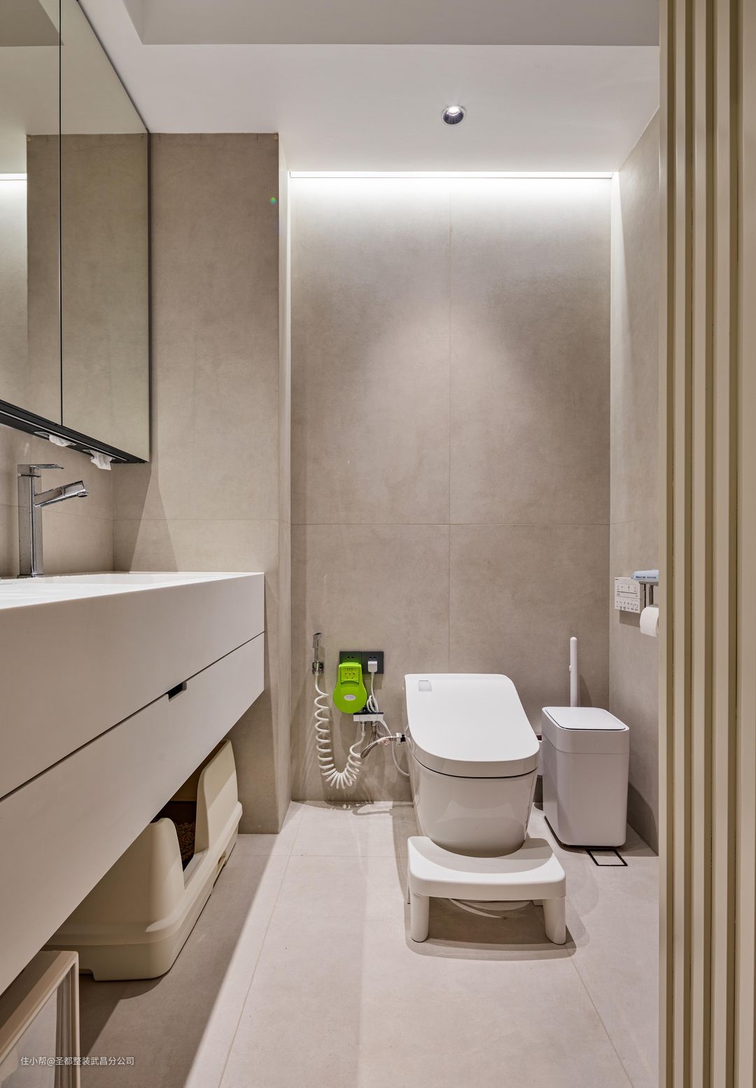 超大面的化妆镜,内部是大面积的收纳空间,放置业主的化妆品和护肤品肯定是没问题,洗手台下方有一个超大抽屉,够高的离地空间还可以收纳其他大件生活用品。