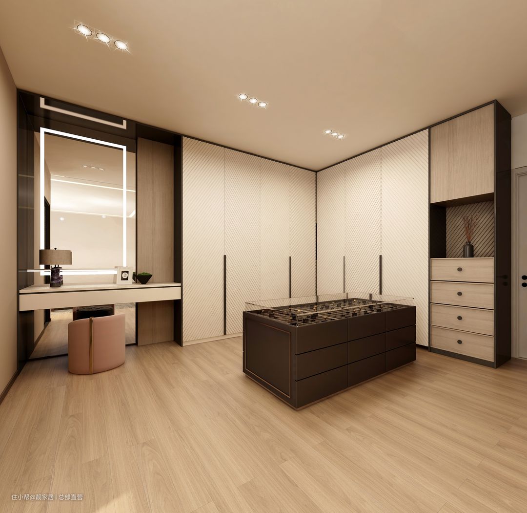 衣帽间分区明确。全身镜嵌入墙面,与悬空台面自成梳妆区,简单轻盈;巧妙利用转角位,打造无把手隐形柜,将每一寸空间发挥到极致;增设展示立柜,放入精致的小饰品点缀,让卧室更有格调。
