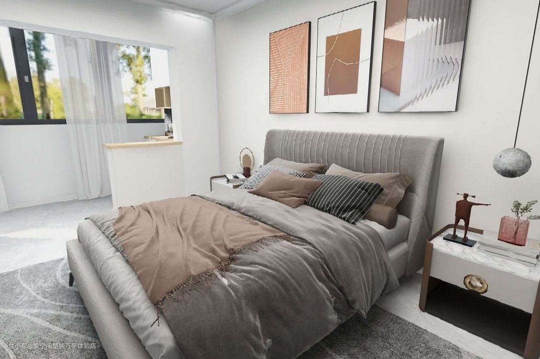 主卧也是非常帅气的白灰配色,将白色大面积使用,显得室内干净还亮堂。衣柜一直延伸到床头处,省去床头柜的摆放,直接在合适的位置掏出开放格,替代床头柜的功能。