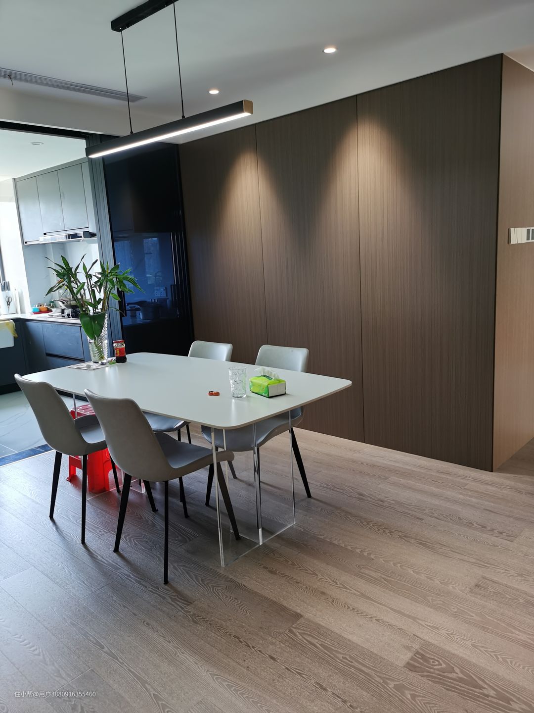 餐厅与厨房衔接,低饱和度的空间色彩,让餐厅空间舒适而自在,简单的四人餐桌干净雅致。餐桌上的绿植与吊灯组合,让空间充满精致清新的气息。