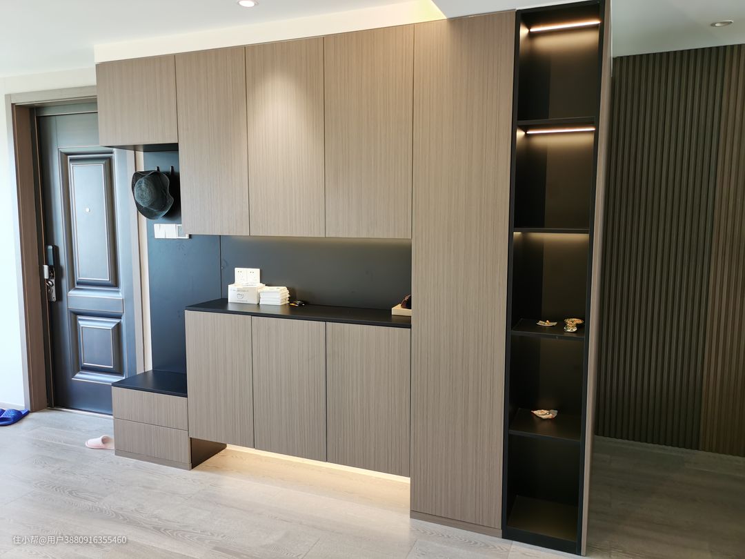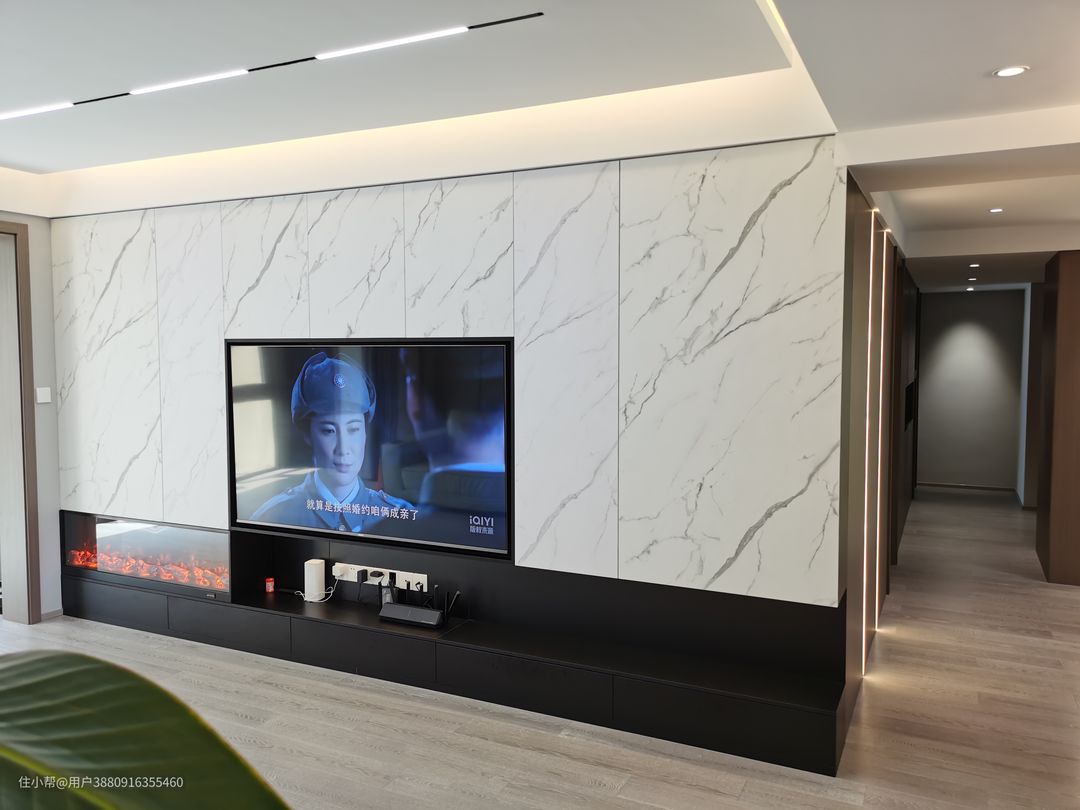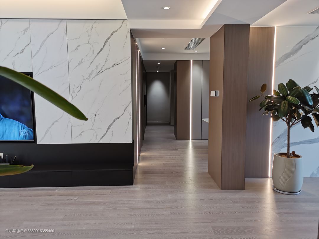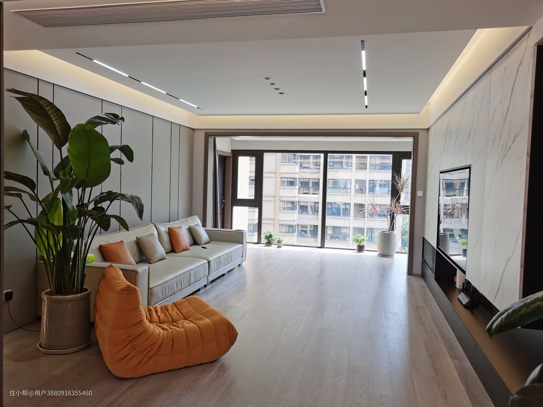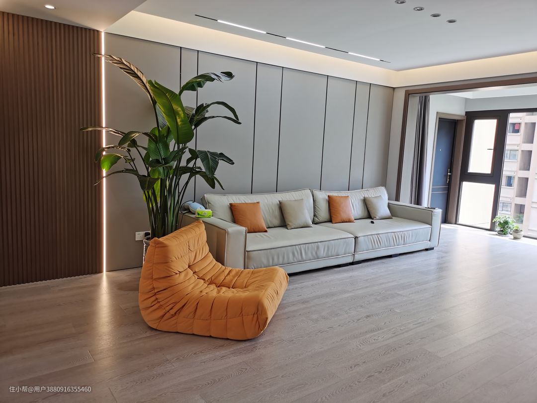 现代风设计的整体空间以舒适简洁为主,低饱和度的灰色系空间色彩布置,又将空间引向惬意又轻松愉悦的氛围。整体设计融入了人文生活的情感,处处透露出人性化的思考。 空间不乏设计感又功能完整,满足身心的双向需求。没有过度的装饰,将现代简洁进行到底,却也通过细微处的设计,使得每处角落皆是风景,让居住者体验平和的时光流逝,细细品味生活中的美好瞬间。 客厅呈现出一种冷静淡雅的气质,同时具有居家的温馨之感。整体利用自然光影、色彩的搭配、以及各种装饰表达了空间情感意境。 浅灰色的皮质沙发,低调质感,搭配鲜活的亮橙色抱枕,以及同色系的亮橙色单人沙发,亮橙色点缀灰色空间,带来一丝活泼。放置在简约的客厅中,带来了一种自然从容的惬意。 灰色的软包沙发背景墙加入线条设计,打破单调,搭配大盆绿色盆景,在不经意间增加了空间情调。 顶上的无主灯设计,简约的灯带,增添了空间的华丽档次,让简约的空间更加浪漫雅致。