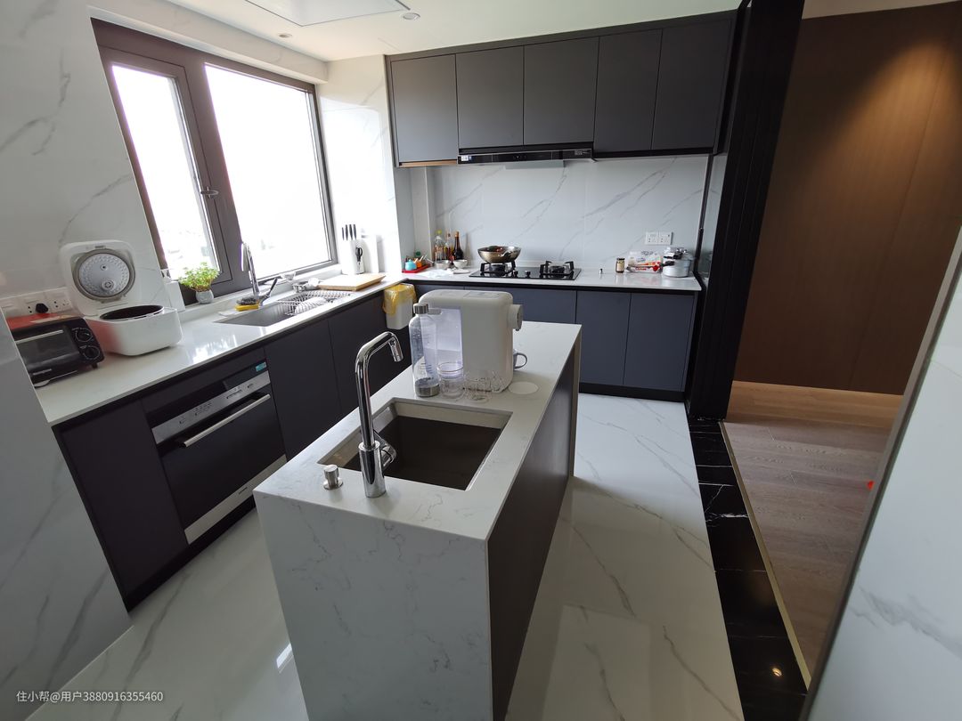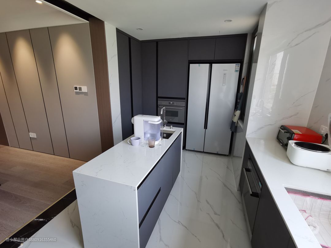 厨房整体开放式设计,与餐厅空间开敞流动。白色瓷砖铺贴墙面与地面,I型空间设计,为主人提供了一个实用舒适的烹饪场所。 用简洁的线条、高级灰的色彩融入整个空间。简洁的墙面线条做轮廓勾勒,没有繁复的装饰,空间简单大方,更合适日常的家用,让餐厨体验更加舒适生活。 嵌入式设计,将冰箱、微波炉等电器收纳其中,紧凑利用每一寸空间面积。