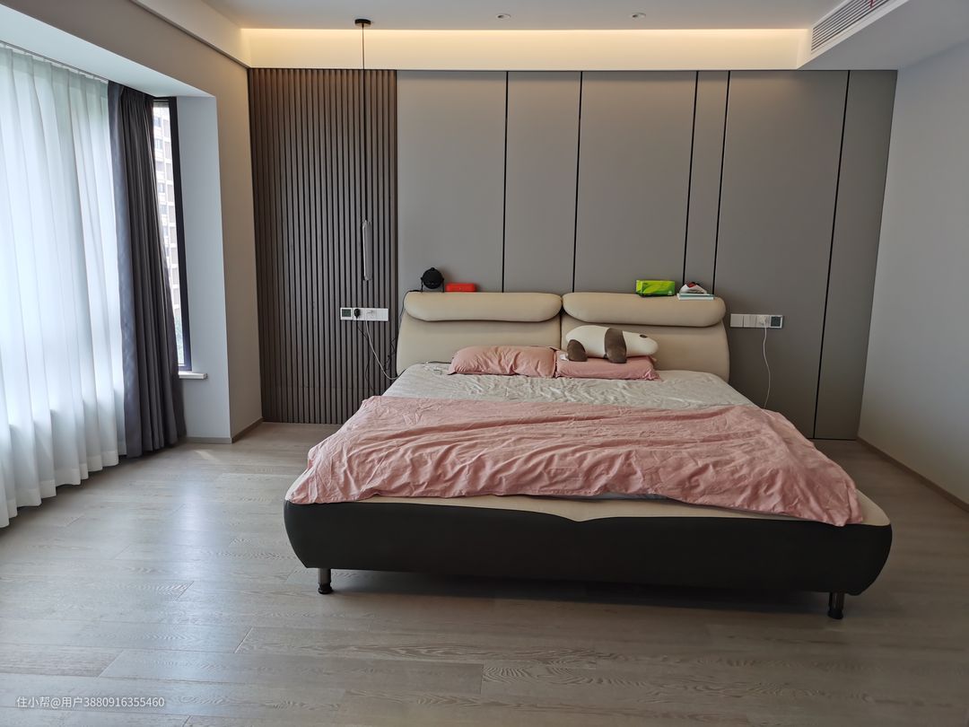 主卧整体色系以黑白灰为主,搭配粉色系床品,呈现出轻松安逸的空间氛围,结束一天的忙绿之余,可以尽情的在此空间休憩身心。 简洁舒适的卧室,素雅的床品与床单布置搭配皮质的靠背,闲适而轻松惬意。