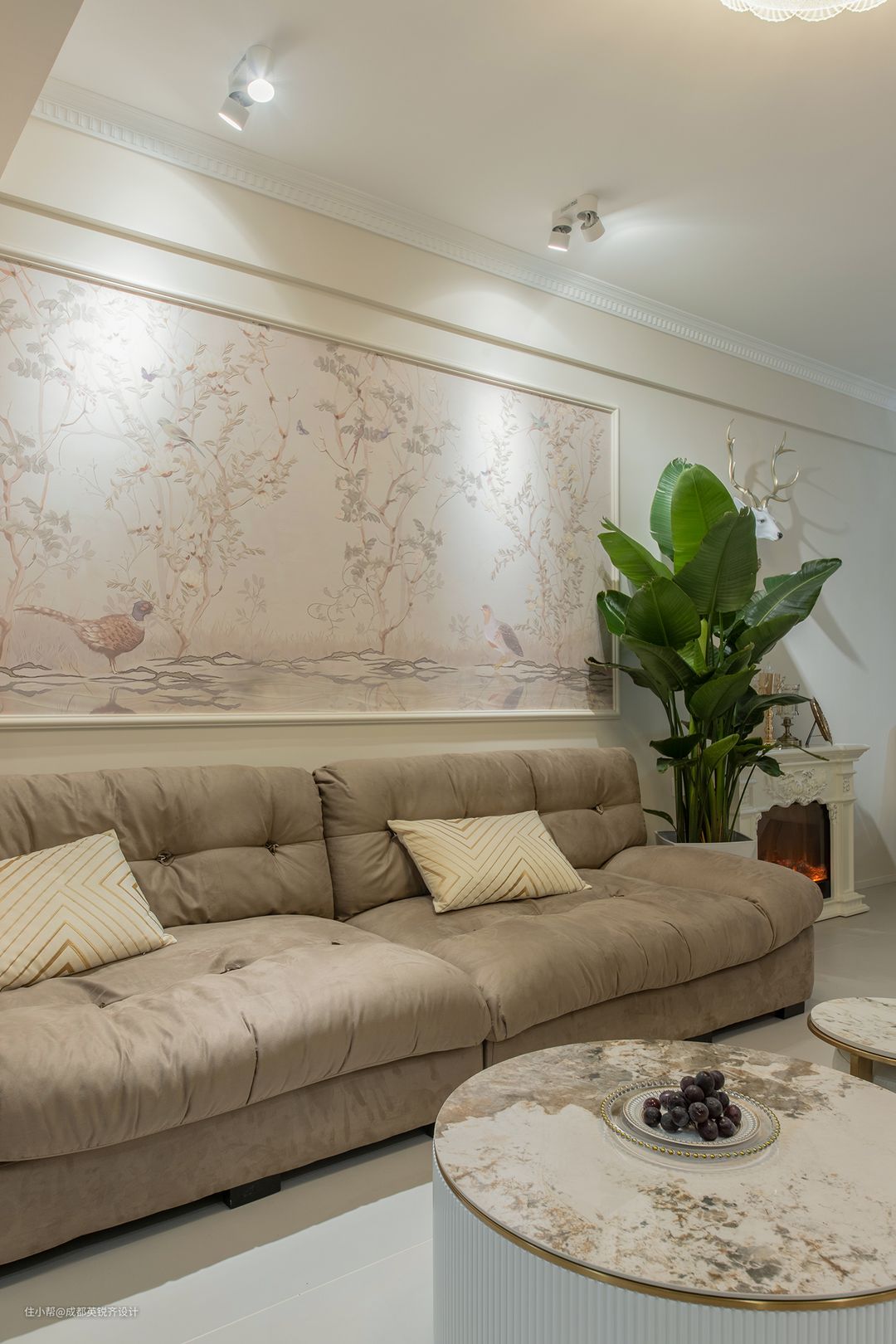 棕色墙面有了石膏线的加入增添了不少立体度 搭配低饱和度的颜色打造出不一样的视觉体验