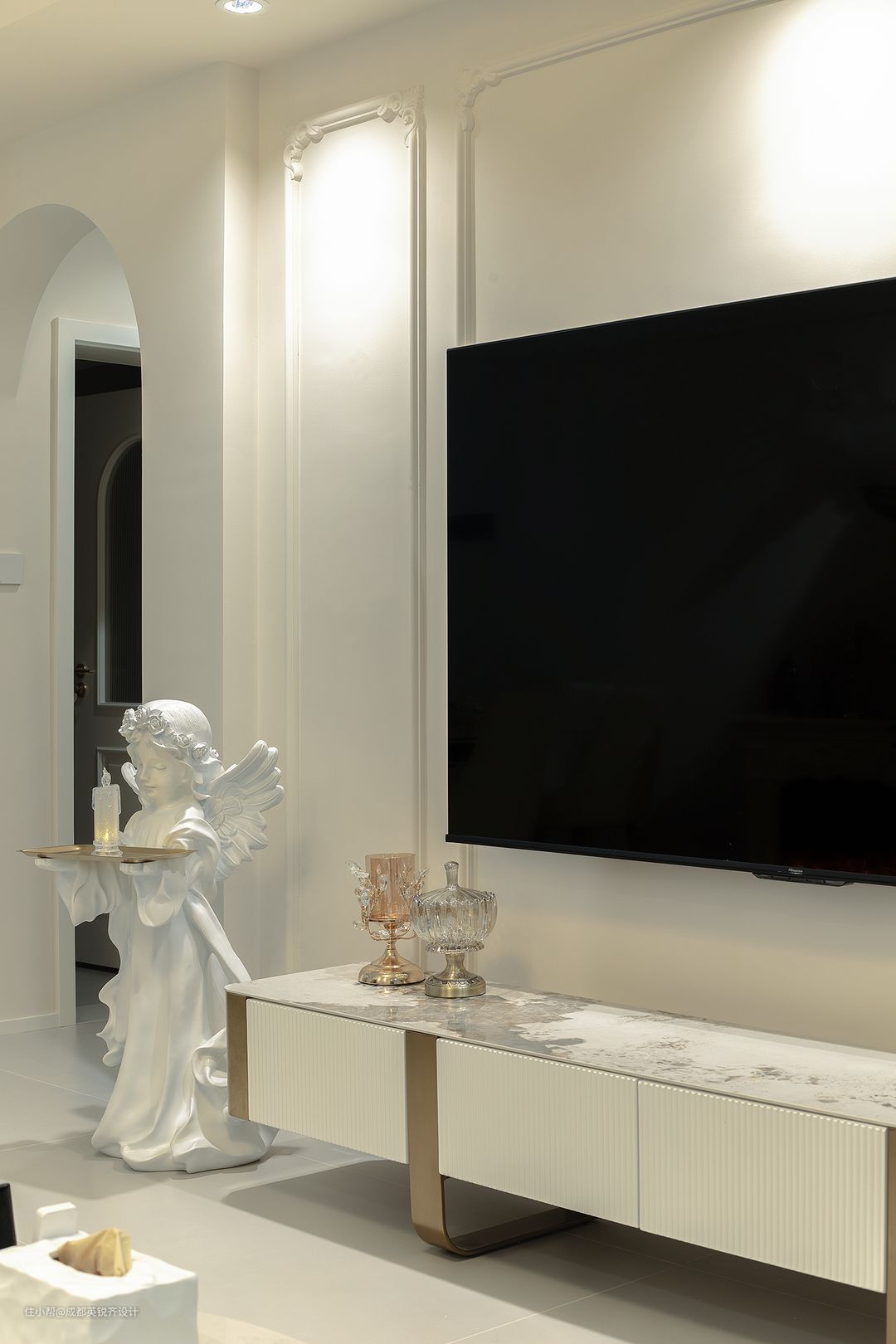 客厅背景是石膏线条+墙布 电视墙是石膏线条+角花