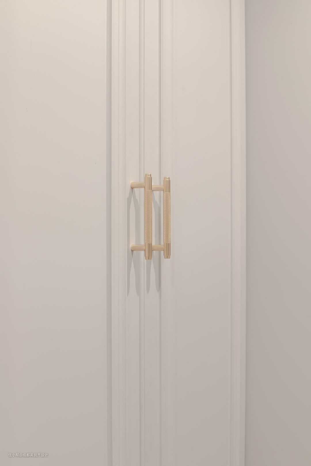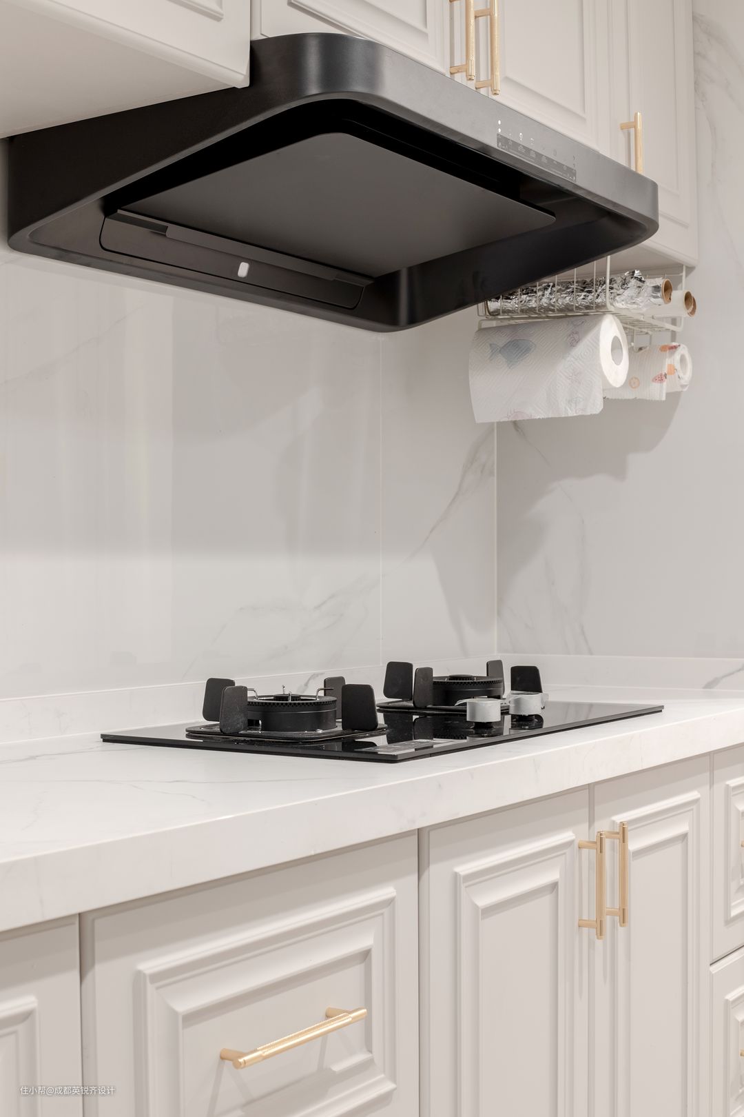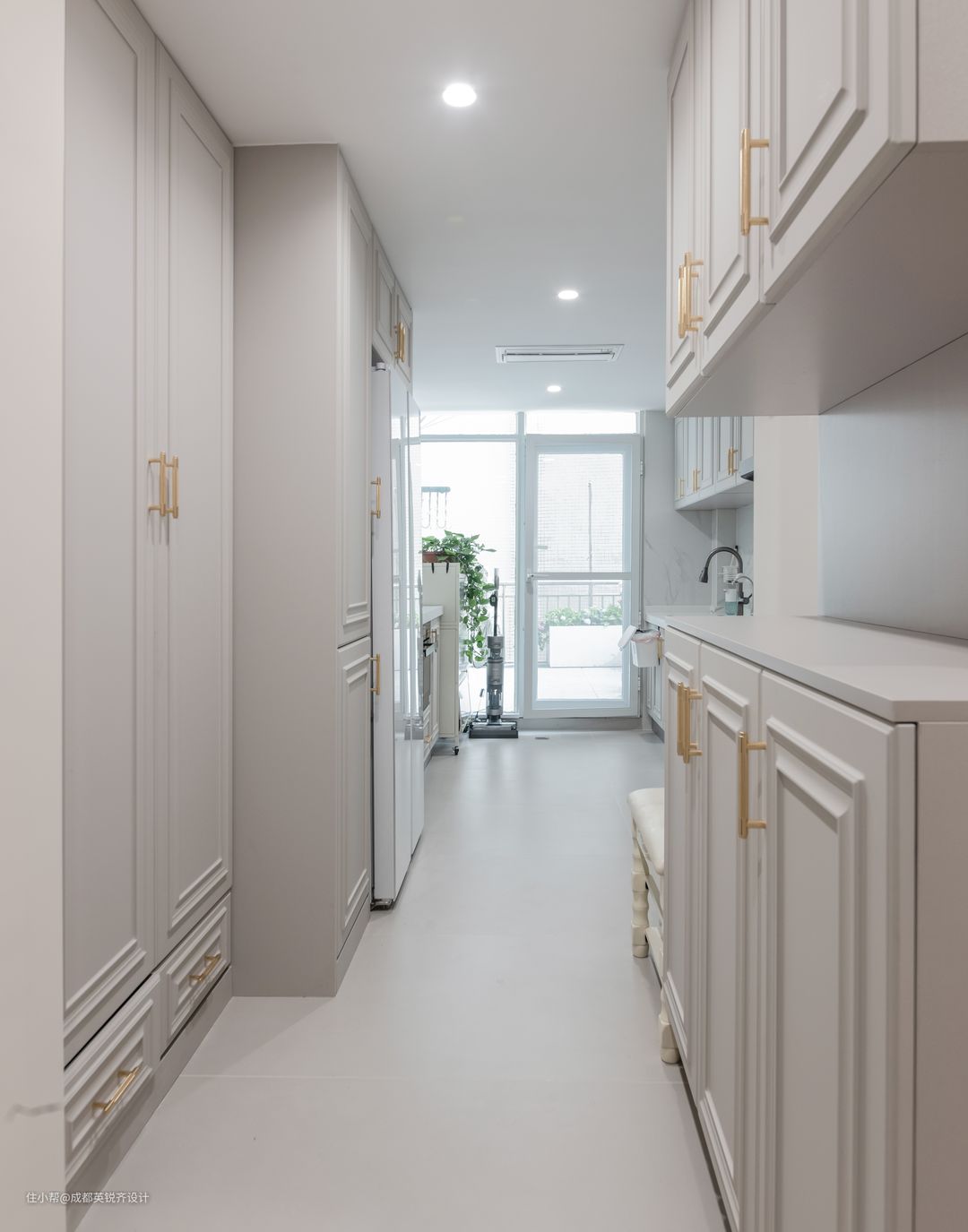 厨房和门厅联动,形成一个开放式厨房 整体厨房采用肤感膜加细线条以及金色有质感的拉手