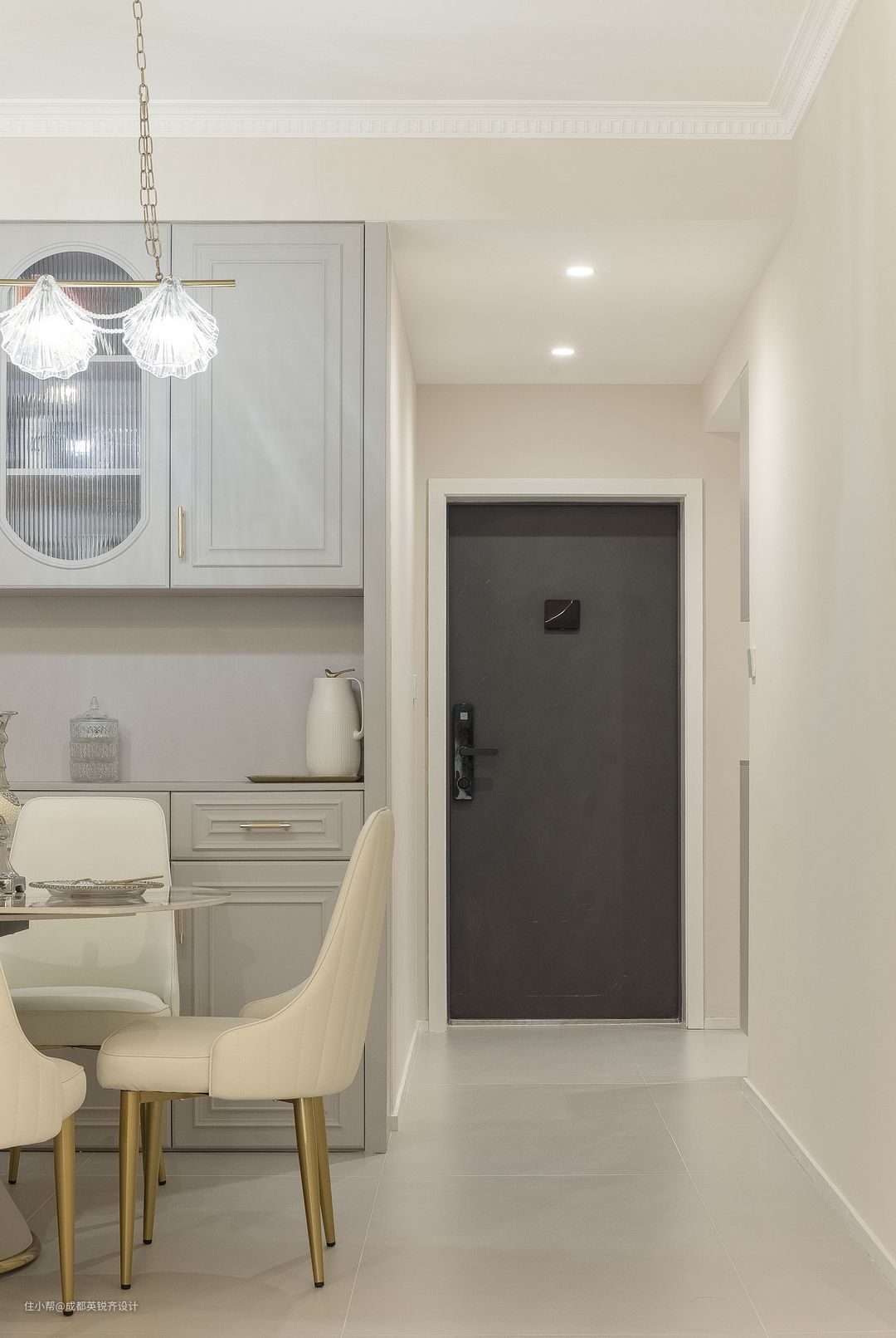 厨房和门厅联动,形成一个开放式厨房 整体厨房采用肤感膜加细线条以及金色有质感的拉手